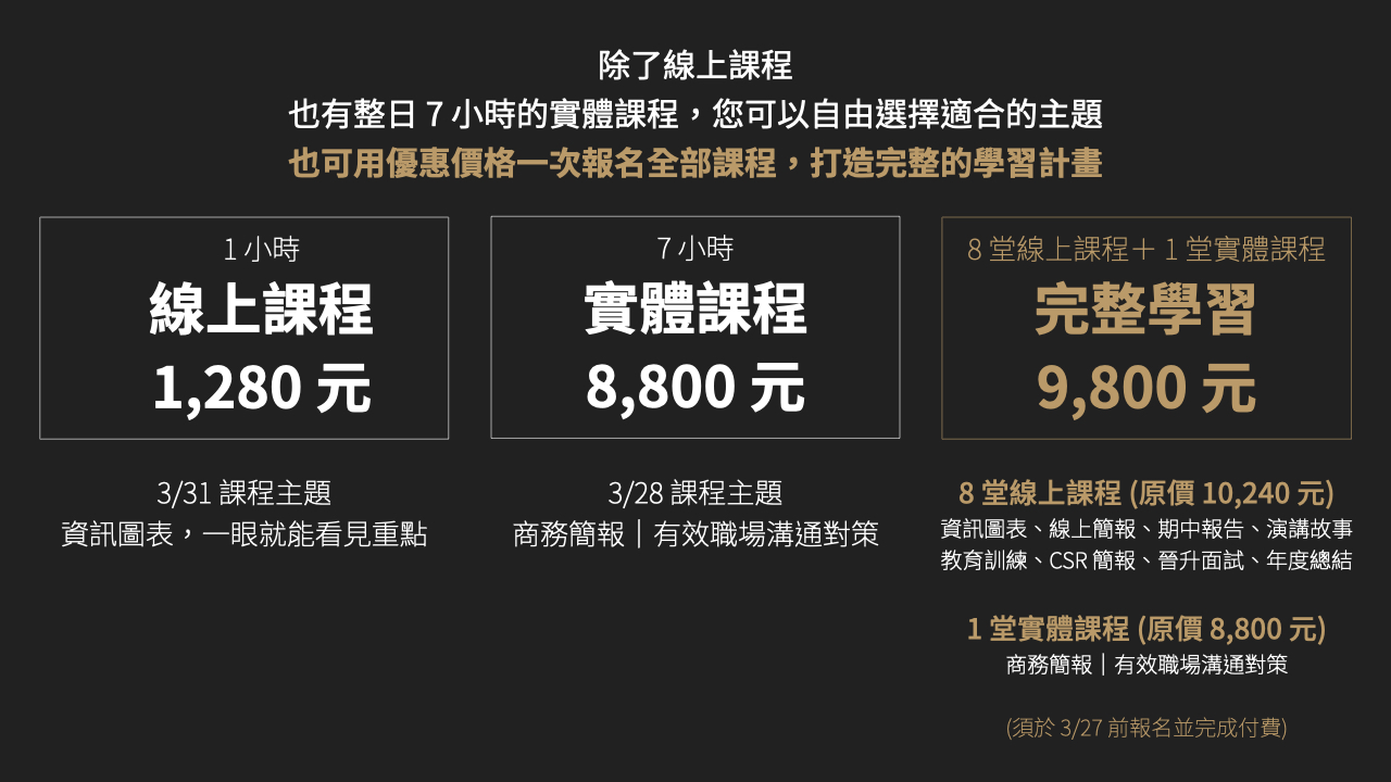 即日起至 3 / 27,您可以用優惠價格一次擁有全部課程,包含全年度 8 堂線上課程,再加贈一堂 7 小時的實體課程,為您打造完整的學習計畫 ! 線上課程可無限回放,在任何時間都能完整學習。