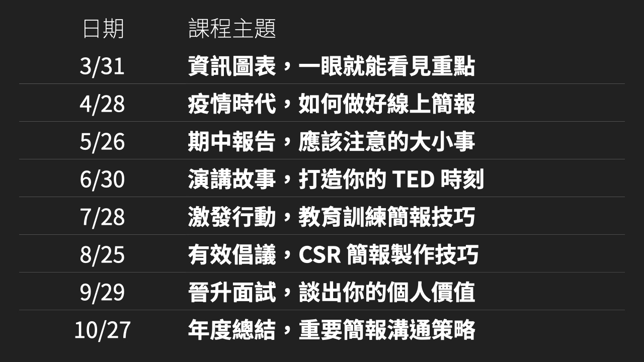 「商務簡報.有效職場溝通對策」以職場人士真實的場景為核心,專注在邏輯結構及有效的視覺呈現,並提供在工作中立即可落地實踐的方法。