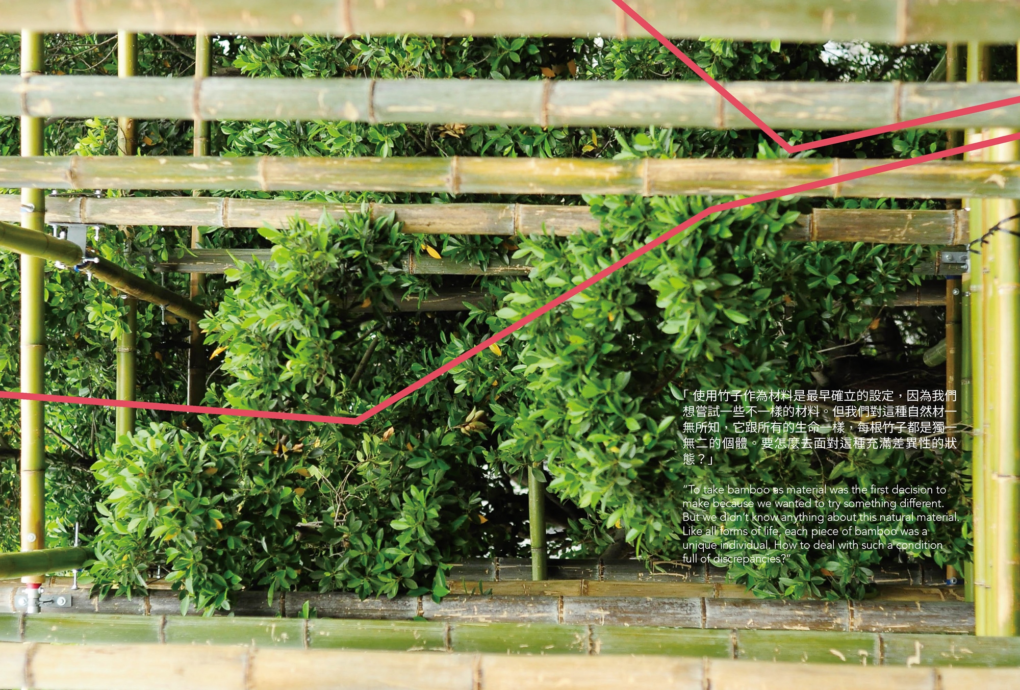 2014年的夏天,北美館入口廣場佇立一座倒梯形的空間,宛如巨大的鷹架城市,以竹構材為主體結構,貫穿著金屬紅線型的扶手,再加上人走進環場步道,體驗不同的視平面與身體經驗,享受高處的陽光與樹林,時而連結構造物,時而連結植物/光線/風,在同一建築空間中共生互存。
