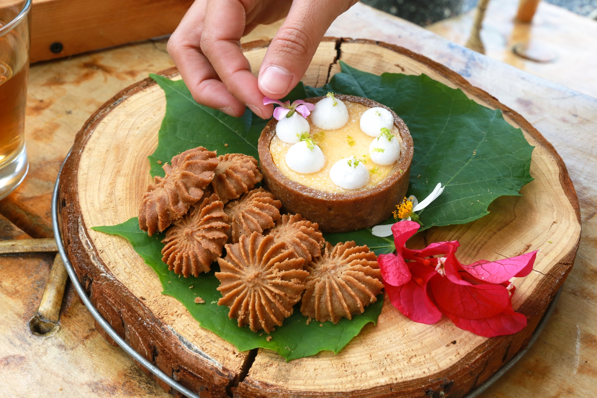 個性活潑、大方的少妮媱,常常出完餐點就跟客人東南西北聊起天來,很難想像是在烘焙坊裡謹慎、細心的甜點主廚。不只如此,少妮媱手裡的甜點食材皆來自親戚的作物,而對製作甜點著迷的她,運用紅藜及小米,像是施展魔術一般,變成一道道可口的點心。