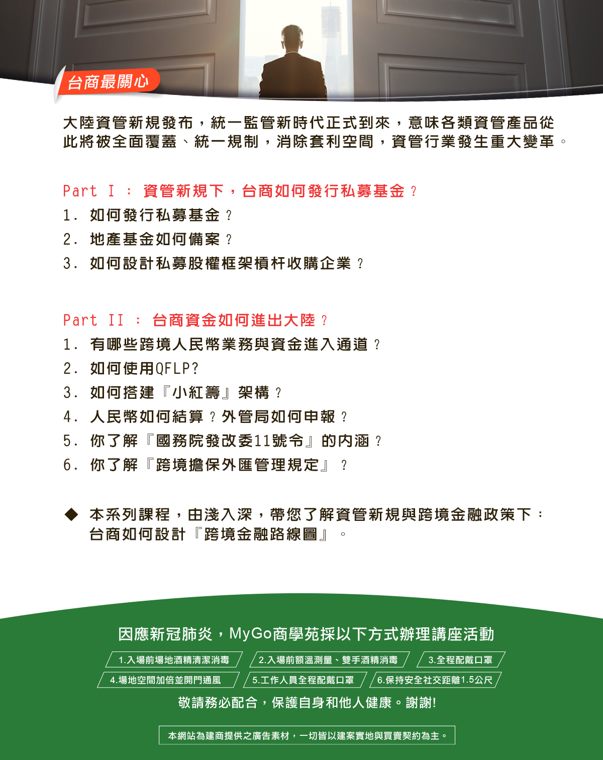 誠摯邀請您參加2/28(日)下午MyGo商學苑之-『台商最關心-資管新規入市,台商資金如何進出大陸&東協房產』,資管新規下,台商如何發行私募基金?本系列課程,由淺入深,帶您了解資管新規與跨境金融政策下,台商如何設計『跨境金融路線圖』。還會分享精選投資標的,讓您了解《東協房產》的獲利要點!現場並備有精緻下午茶點心🍰🥐☕️。
