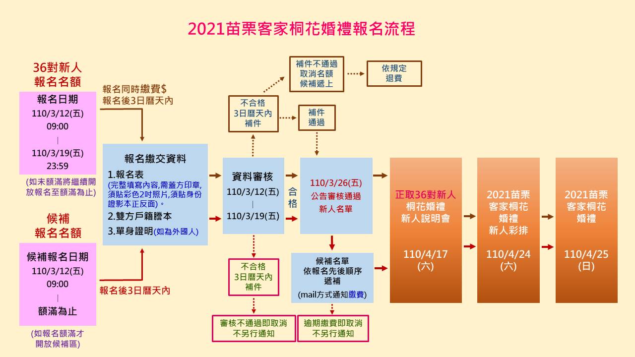 - 凡線上報名完成後,報名繳費後,2021苗栗客家桐花婚禮 報名表(共4頁)與戶籍謄本等資料,請翌日起3個日曆天內繳交,逾時視同未完成報名手續,退款金額將扣除10%帳務處理費,恕不另通知,該名額釋出,供候補遞上。