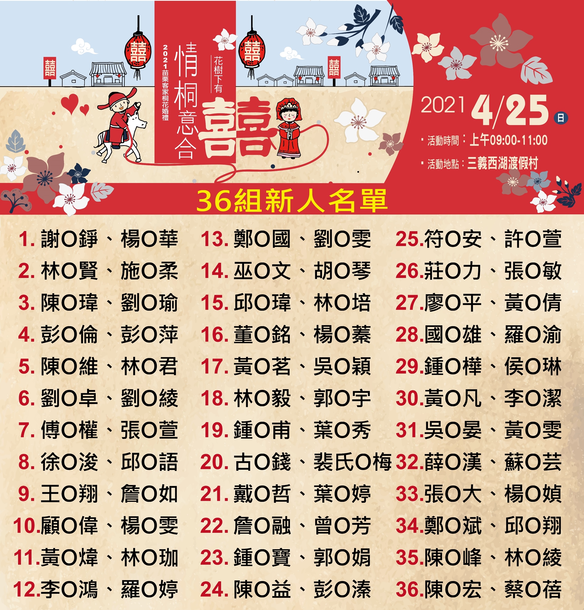 - 苗栗組:16對新人報名對數(雙方新人需其中一人設籍於苗栗縣民) 。