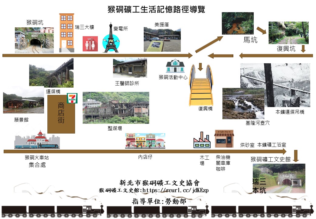 火車站、願景館、選煤場、運煤大橋、猴硐坑、瑞三大樓、變電所、醫護室(王醫師診所)、美援厝、馬坑、復興坑、復興橋、木工場、柴油機關車庫、烘砂室、礦工浴室、運煤吊橋、本鑛坑口