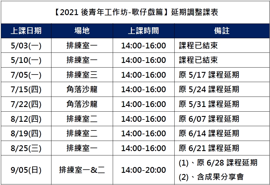 受到嚴重特殊傳染性肺炎(COVID-19)疫情影響,2021年「後青年工作坊─歌仔戲篇」5/17、5/24、5/31、6/7、6/14、6/21、6/28共7堂課程暫停,為兼顧課程完整性,提供後續補課期程: