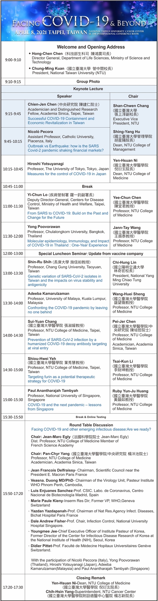 國立臺灣大學醫學院將舉辦「Facing COVID-19 and Beyond」國際研討會,針對新冠肺炎疫情之政策擬定、臨床治療等議題邀請國內外知名學者,交換各國經驗,希望能集結國內外與新型冠狀病毒研究有關之學術能量,為地球村盡一份心力。