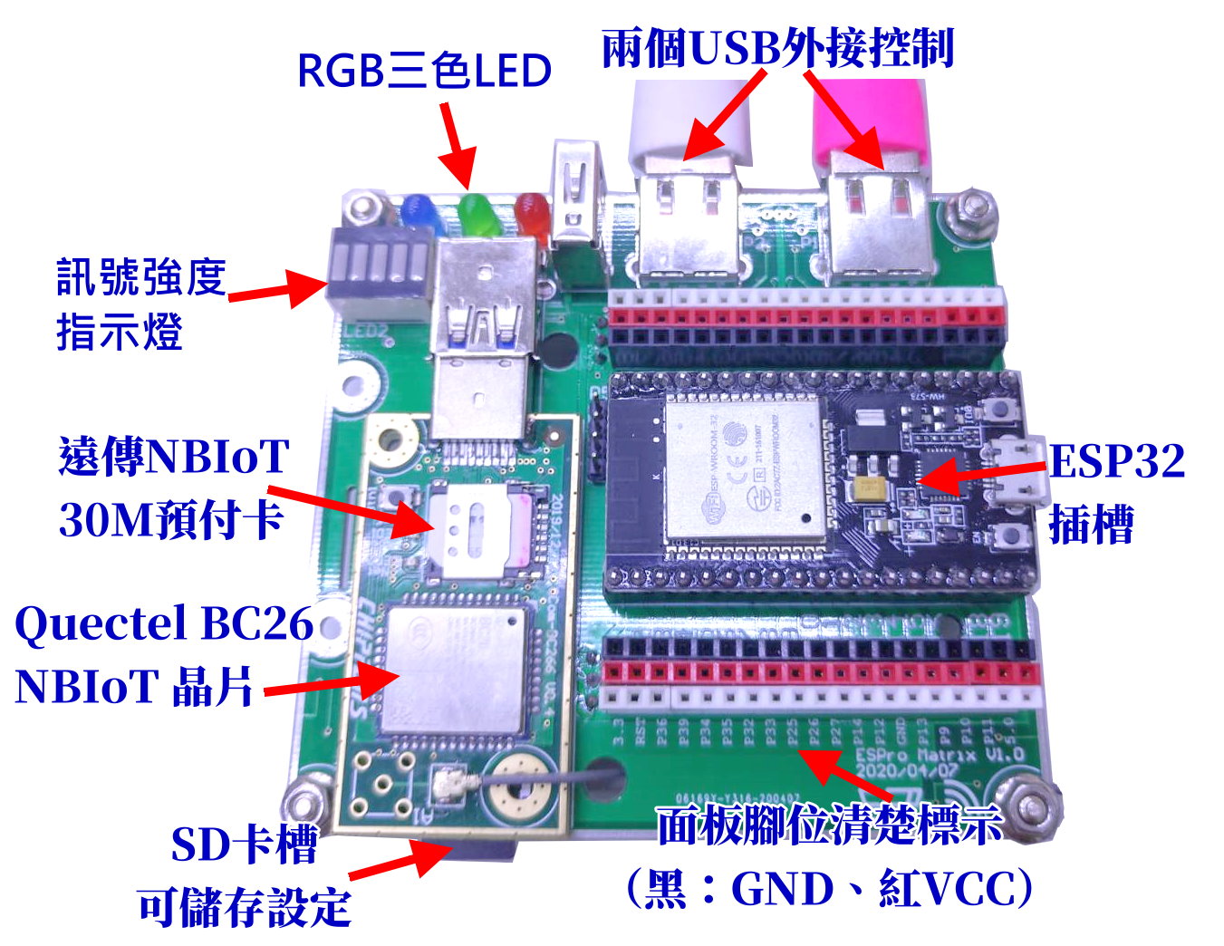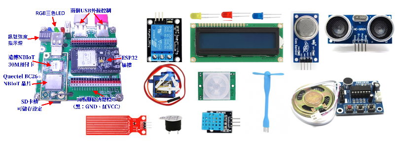 ESP32晶片、教學板、NBIoT、溫濕度、繼電器、人體紅外線、錄放音模組、瓦斯、水位、超音波、蜂鳴器、LED、USB風扇、1602 LCD等十多種常見感測器