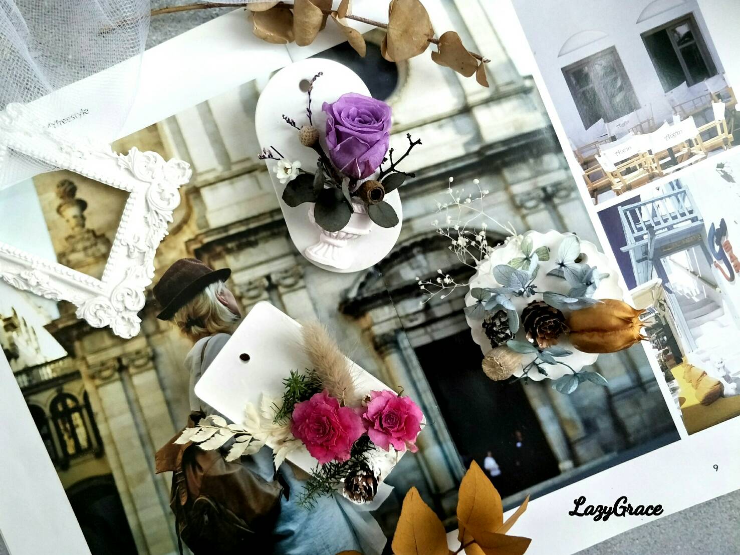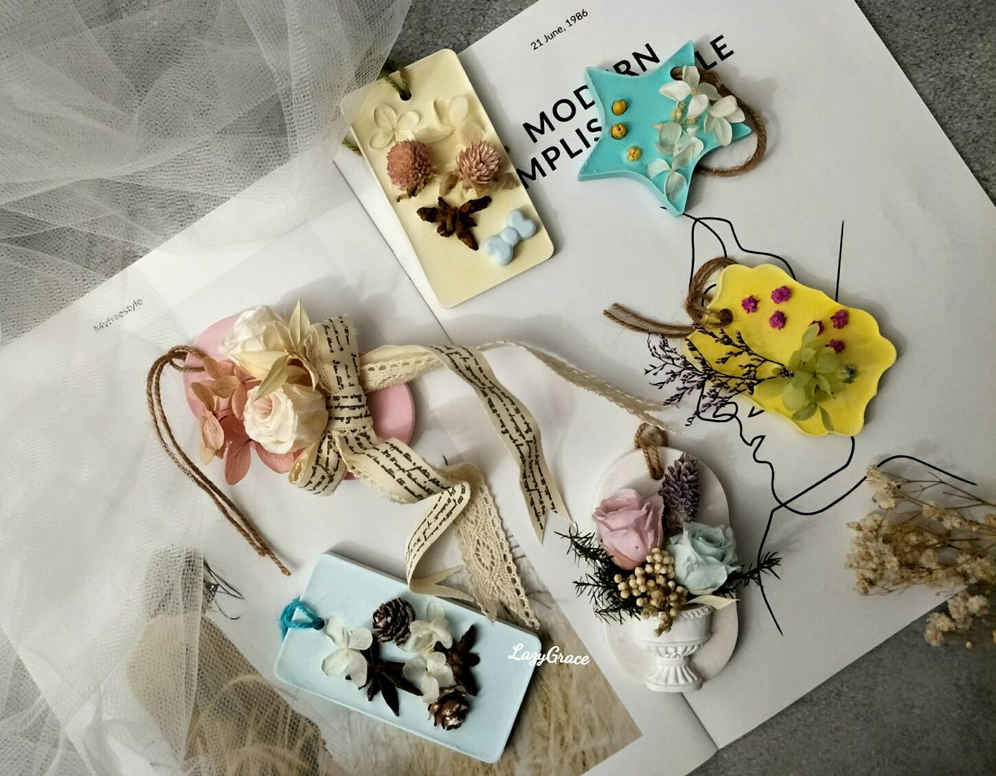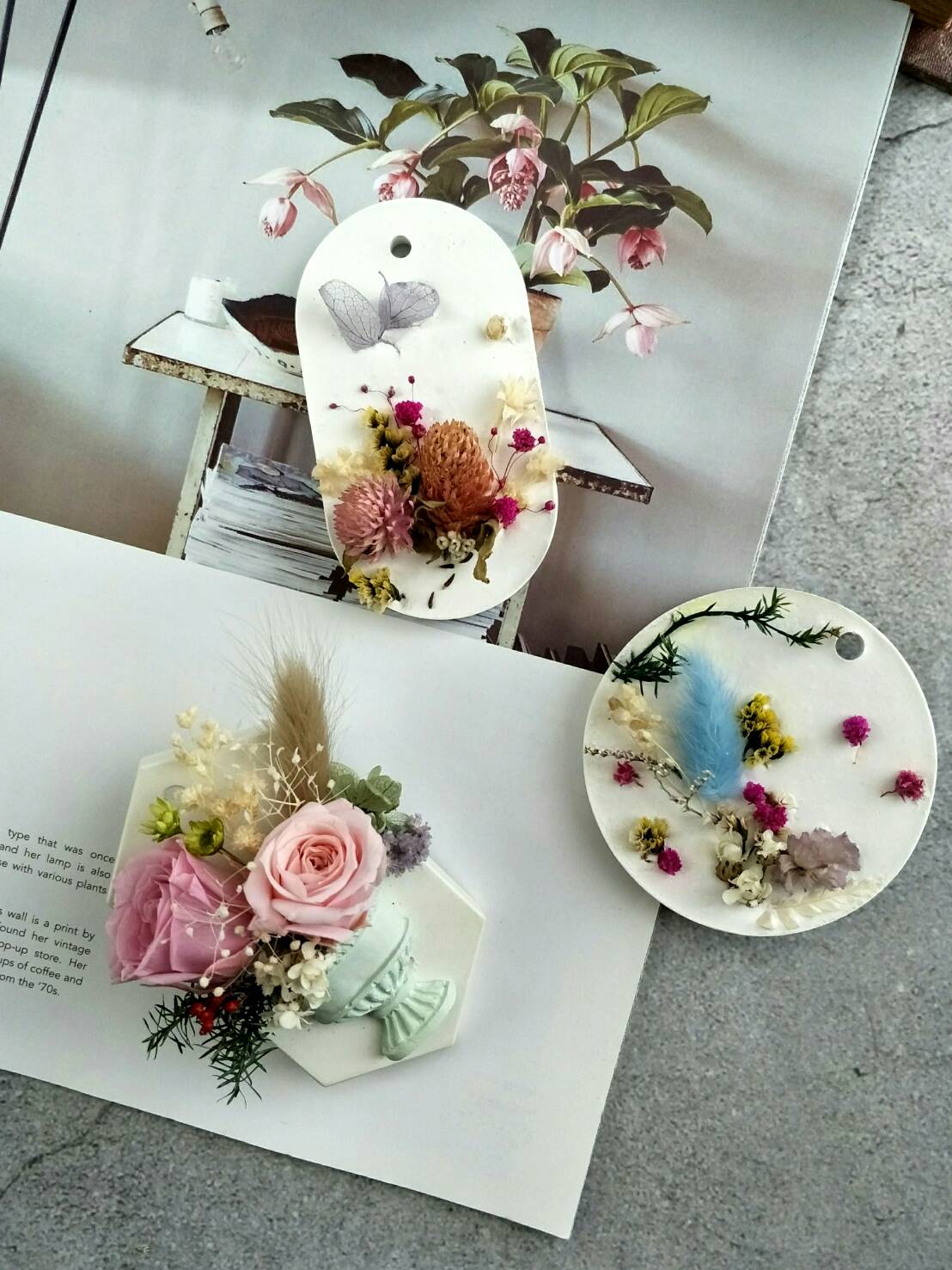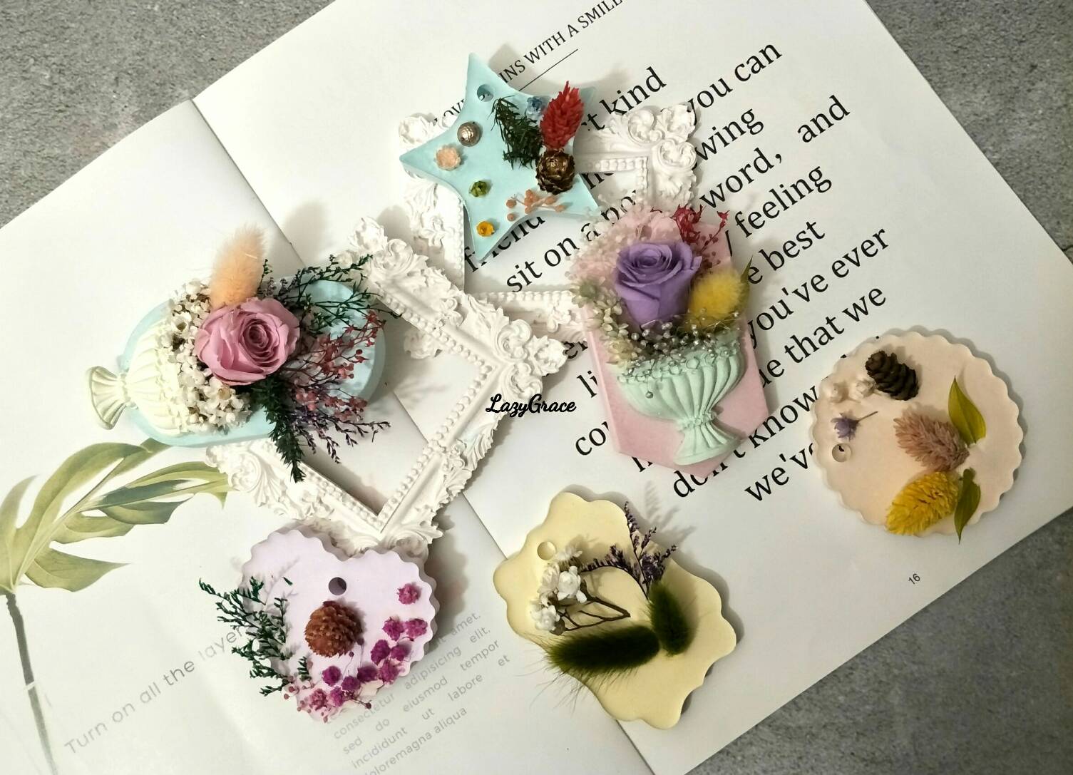 用花草裝飾的擴香石,奢侈的放上不凋花,利用石膏容易吸附與擴散香氣的特性,做出獨一無二的擴香石。把花與香氣一起鑲嵌在這小小的方寸中,留下最美的回憶。