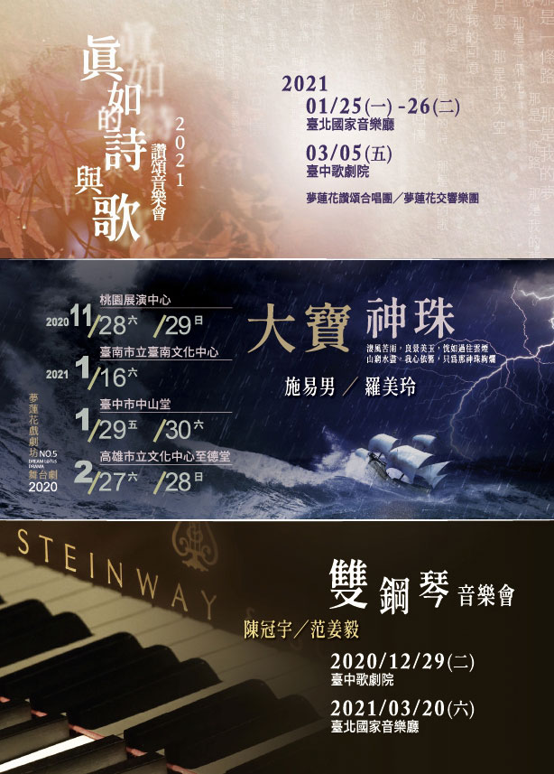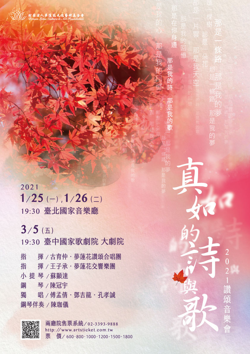 曾獲 2018年國家音樂廳兩廳院音樂類銷售總票券數排行冠軍的「夢蓮花文化藝術基金會」的讚頌音樂會,在經年獲得廣大聽眾們的肯定後,2021年音樂會特別以《真如的詩與歌》為主題,將福智團體真如老師優美如詩的讚頌創作,化為真摯的祝福,為世界各地受災疫苦難的眾生,傳遞心靈深度的療癒。音樂會將真如老師多年來對諸佛虔誠的禮讚,以及潛心依師學法的修為,透過曼妙如詩、淨化心靈的美麗讚頌傳遞。