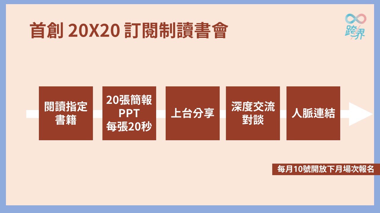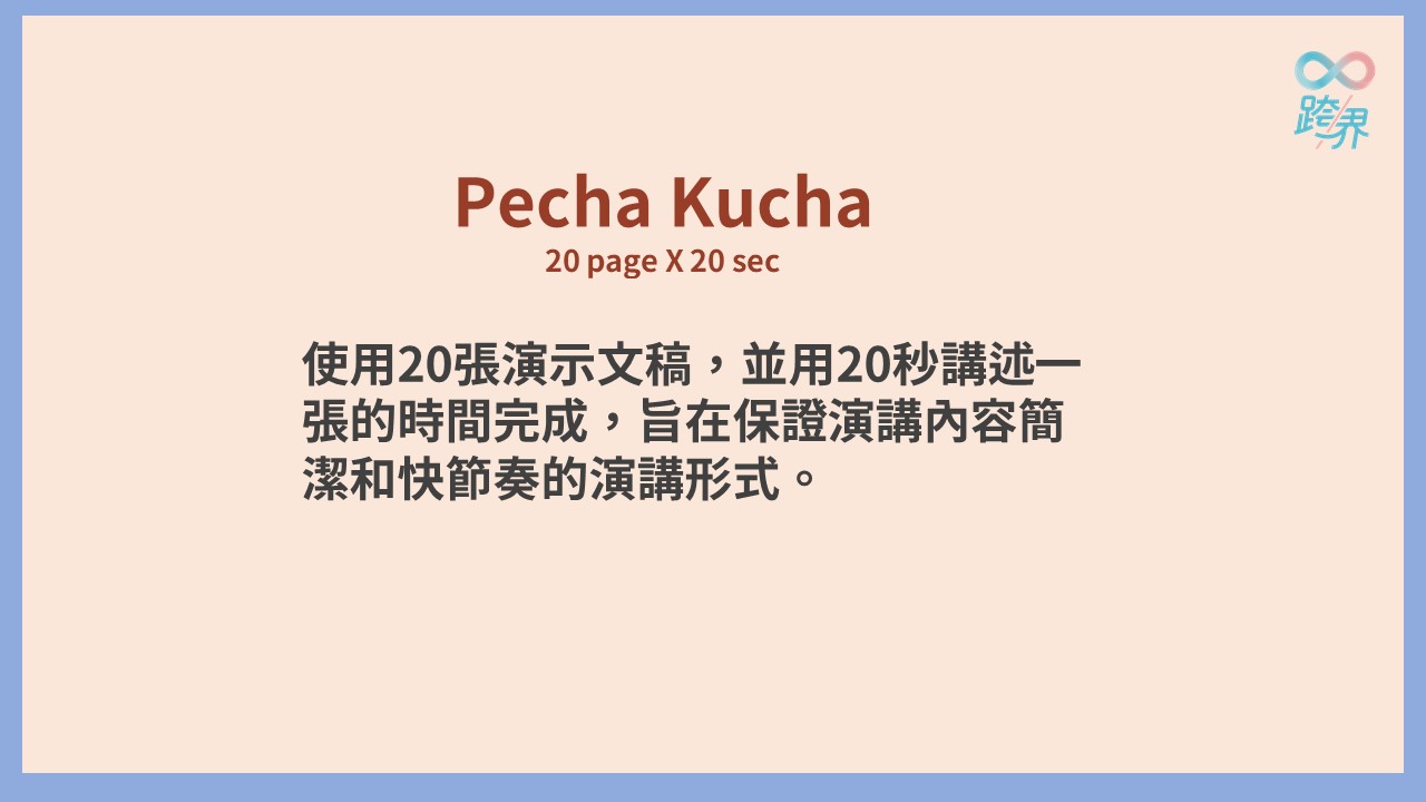 1.每人準備一份簡報,簡報規定為20張PPT、每一頁20秒,一人6分40秒 結合書中觀點,述說自己的故事。確保當日流程進行順暢,事前須繳交到跨界讀書會社團。(示意圖如下)