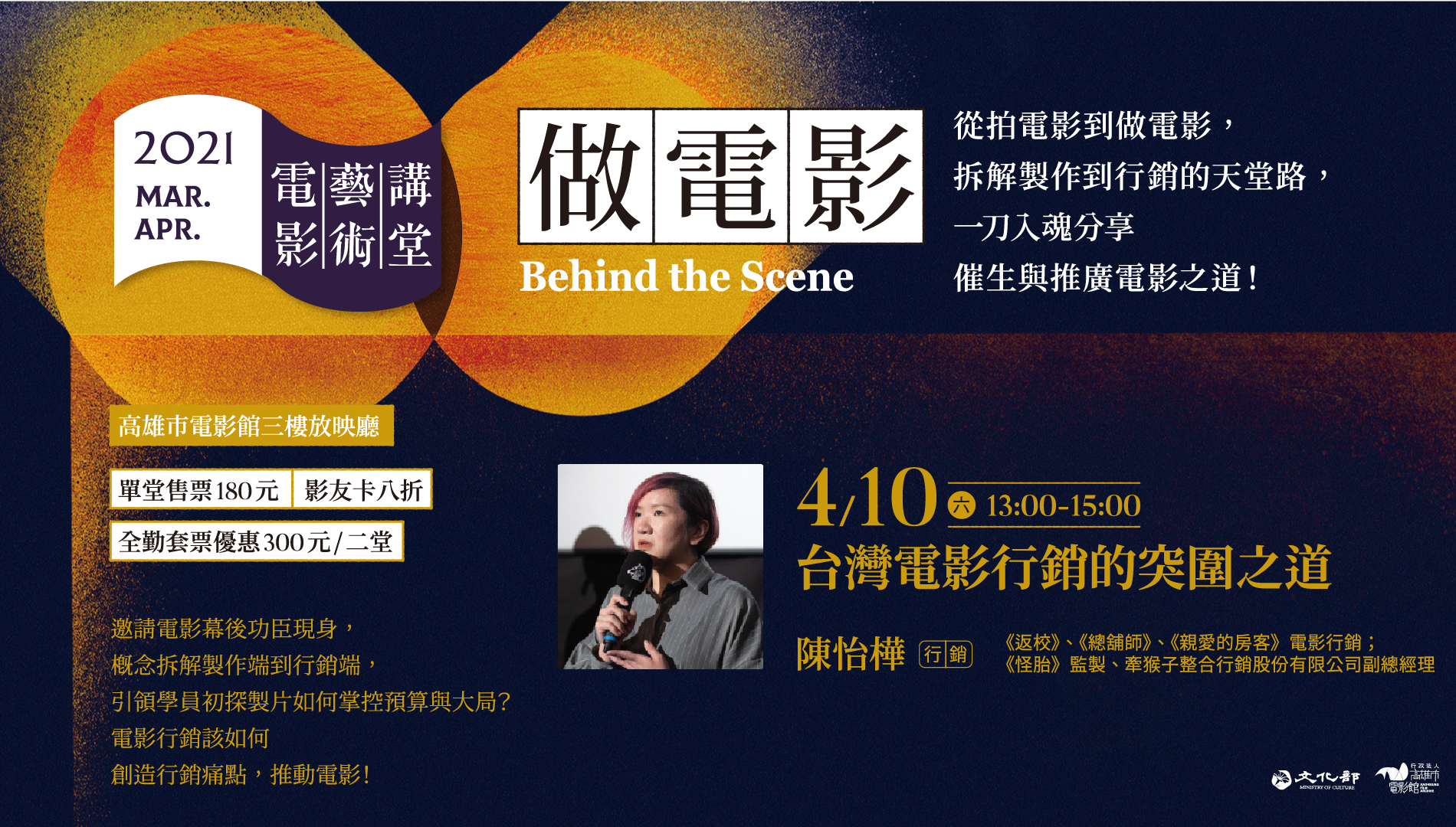04/10(六) 13:00~15:00,講師:《返校》、《總舖師》、《親愛的房客》電影行銷;《怪胎》監製、牽猴子整合行銷股份有限公司副總經理陳怡樺