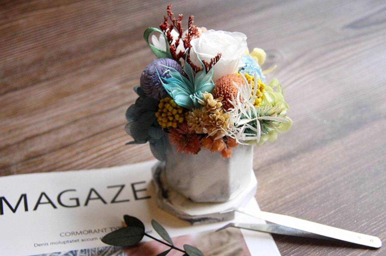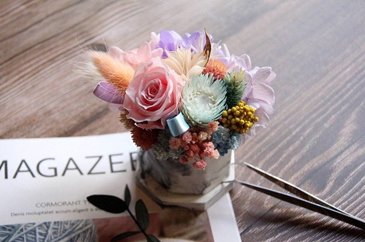 成品出來,不管是妝點家裡的收藏品,或是送給他人表達自己的心意別出心裁,都非常適合唷! 快來體驗水泥盆永生花吧!
