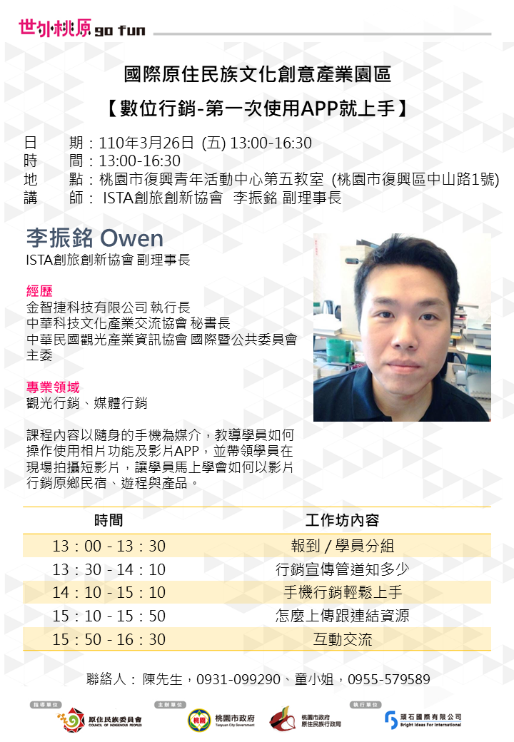 地 點:桃園市復興青年活動中心第五教室 (桃園市復興區中山路1號)