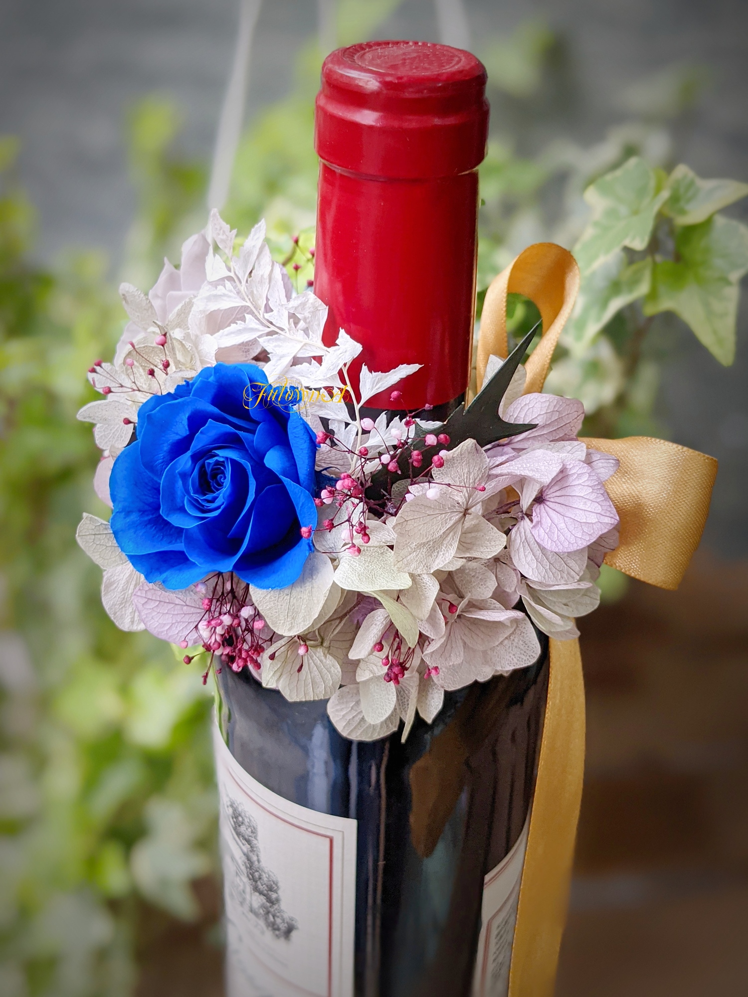 手作過程中的永生花材,我們只選擇有信譽與品質的「日本AUBE不凋花協會」花材。搭配的花色和花材非常有品味,跟著自己的節奏,完成專屬於那珍愛酒瓶的「酒瓶裝飾花」。不管是當成自己酒櫃中的擺飾或是送人,都非常適合! 快來體驗吧!
