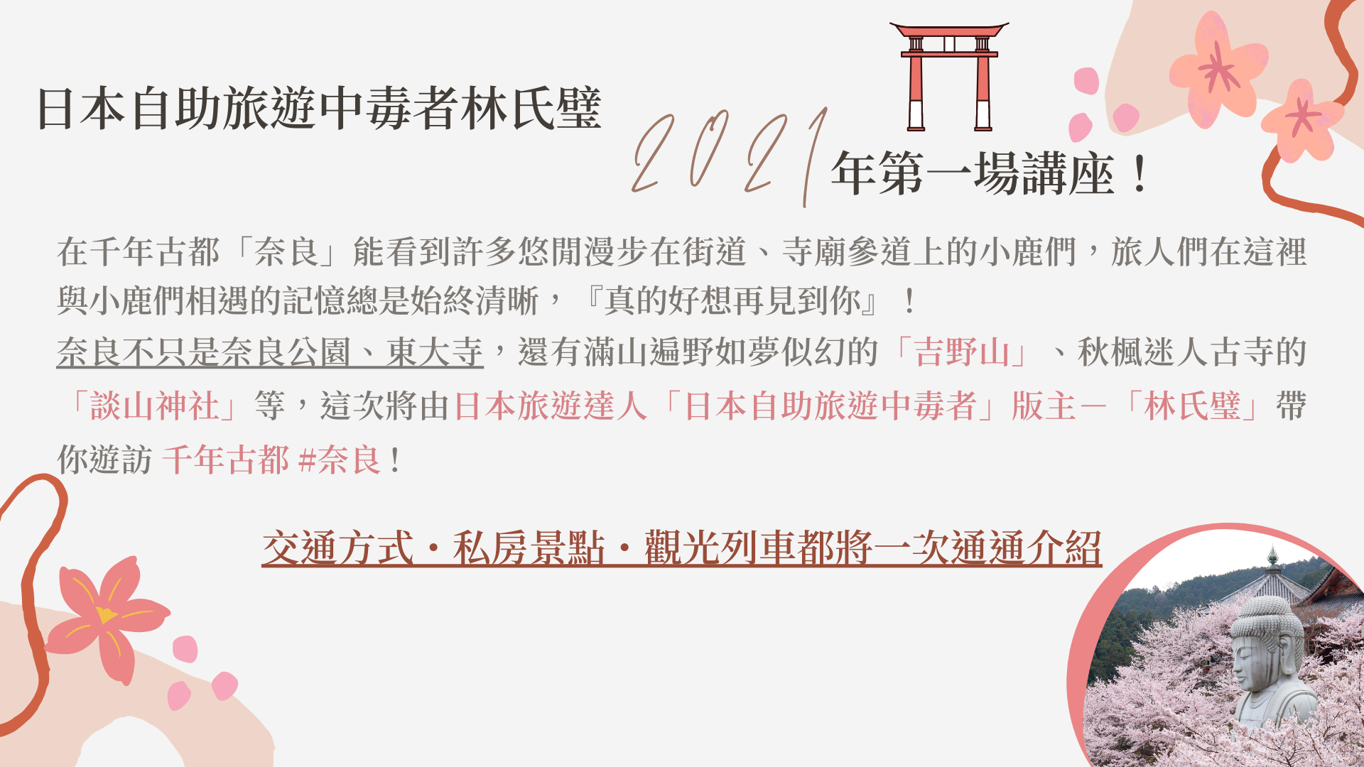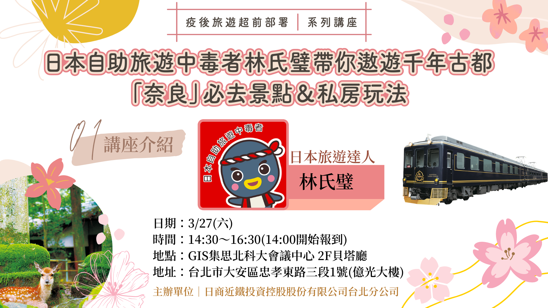 【日本自助旅遊中毒者林氏璧帶你遨遊千年古都】 奈良必去景點&私房玩法 旅遊講座 3/27(六) 台北