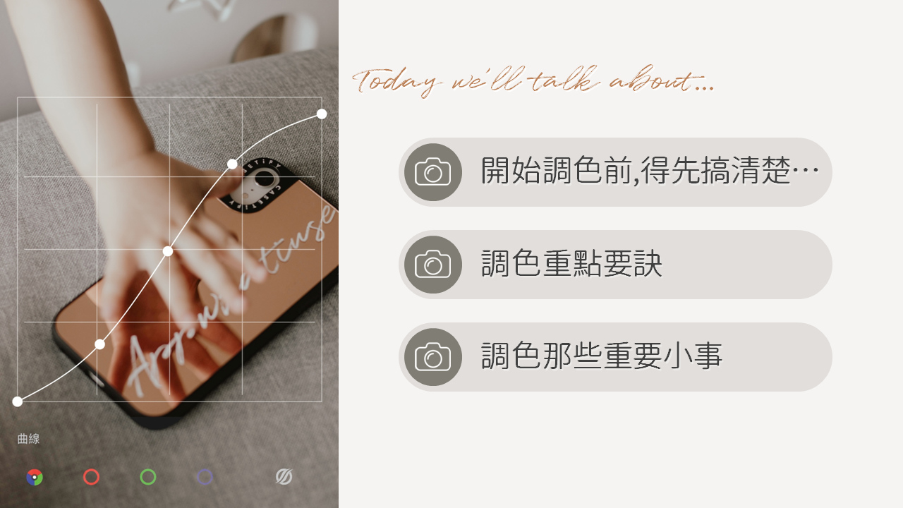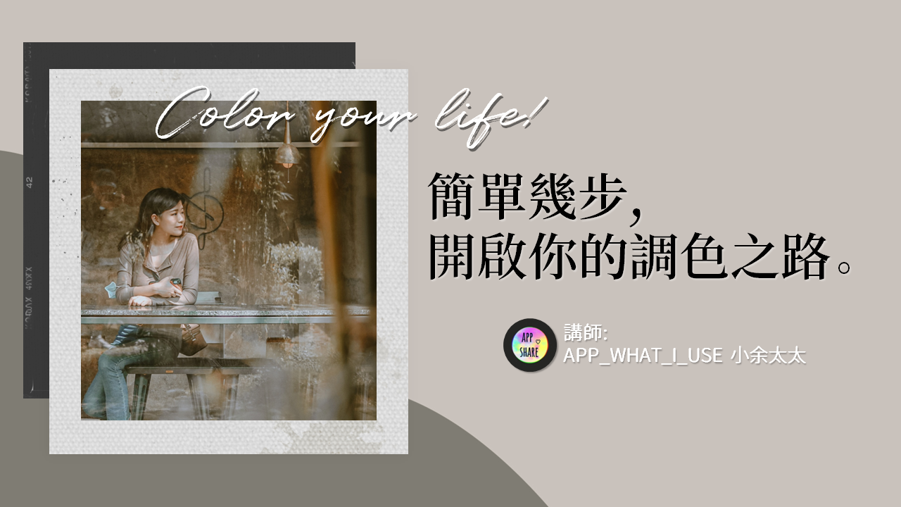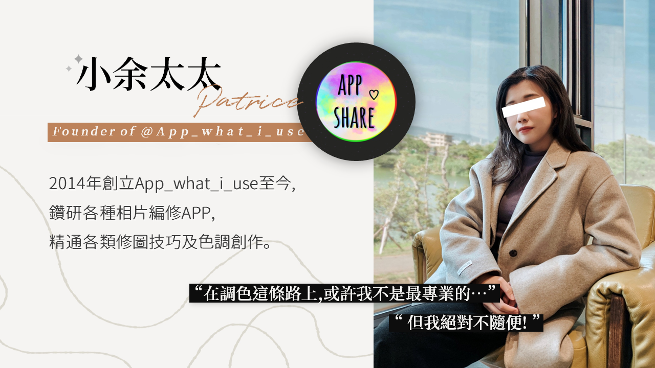 2014年創立APP_what_i_use至今,鑽研各種相片編修APP,精通各類修圖技巧及色調創作,本次課程內容包含:Lightroom 起手式:工具講解、抓重點!替照片挑選合適的色調、快速上手!我調色的步驟順序、調色的你,不能不知道的事等四大重點;透過LR工具,教你學會調色,讓照片質感提升!。
