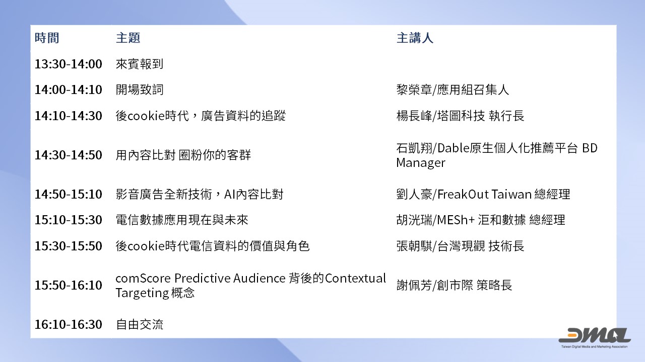 在第三方Cookie缺席廣告市場的狀況下,包括媒體及相關廣告購買者,尋找替代性解決方案成為今年對數位行銷產業最重要的議題,為此,DMA協會特別舉辦【數據混搭-後Cookie時代廣告投放】活動,探討未來廣告投放的解決方案,一同創造數位行銷共榮圈。