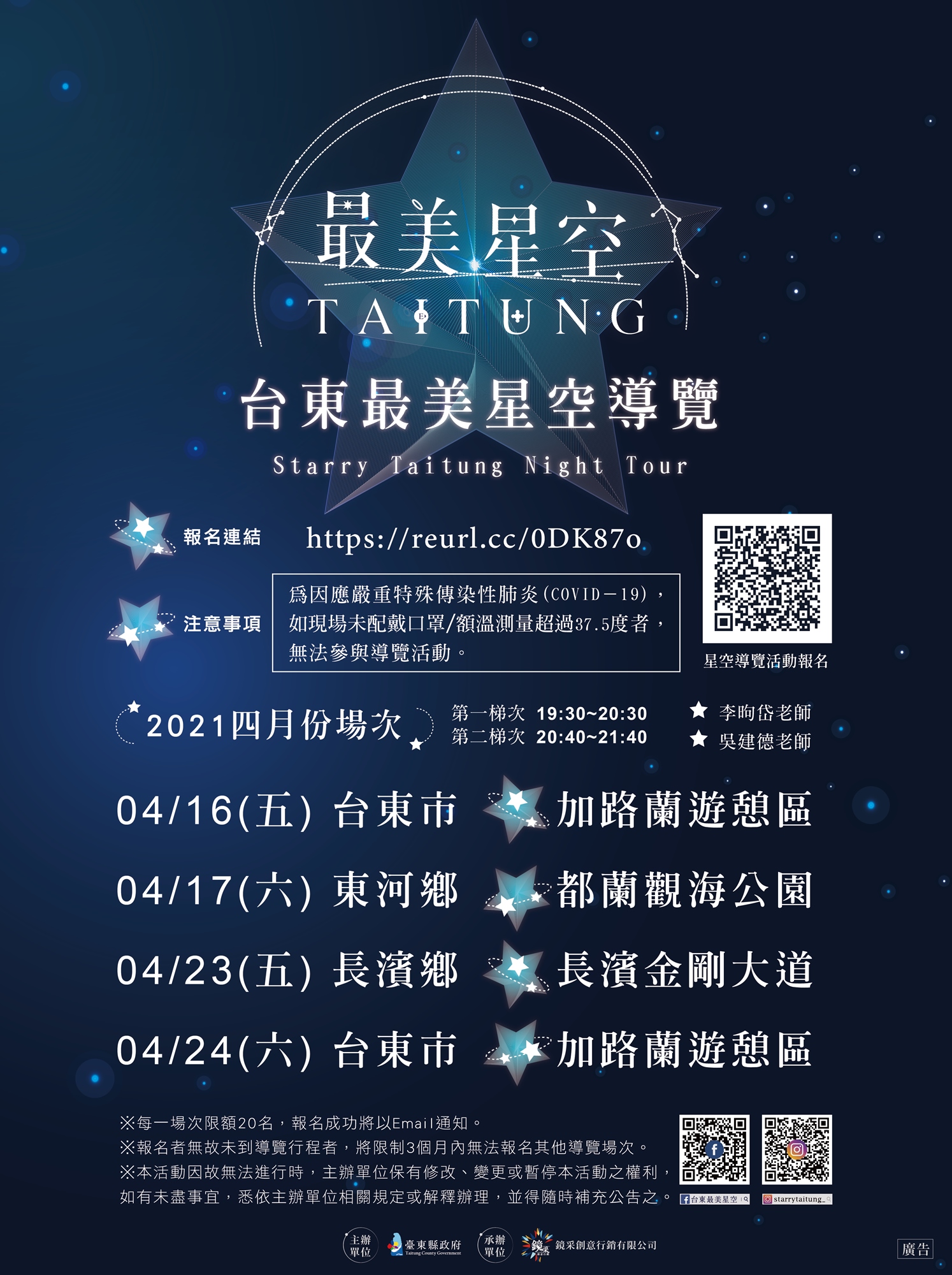 本活動由臺東縣政府舉辦,由天文專家為您介紹14個台東最美星空觀星點位,認識天體、講述星座故事與天文知識。