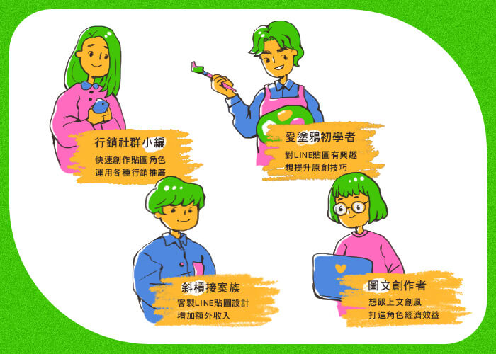 - 教會你將手繪作品延伸到LINE動/靜態貼圖運用,找到你的學習盲點,課程不只是有創意,更是有效益的打造你的個人IP。