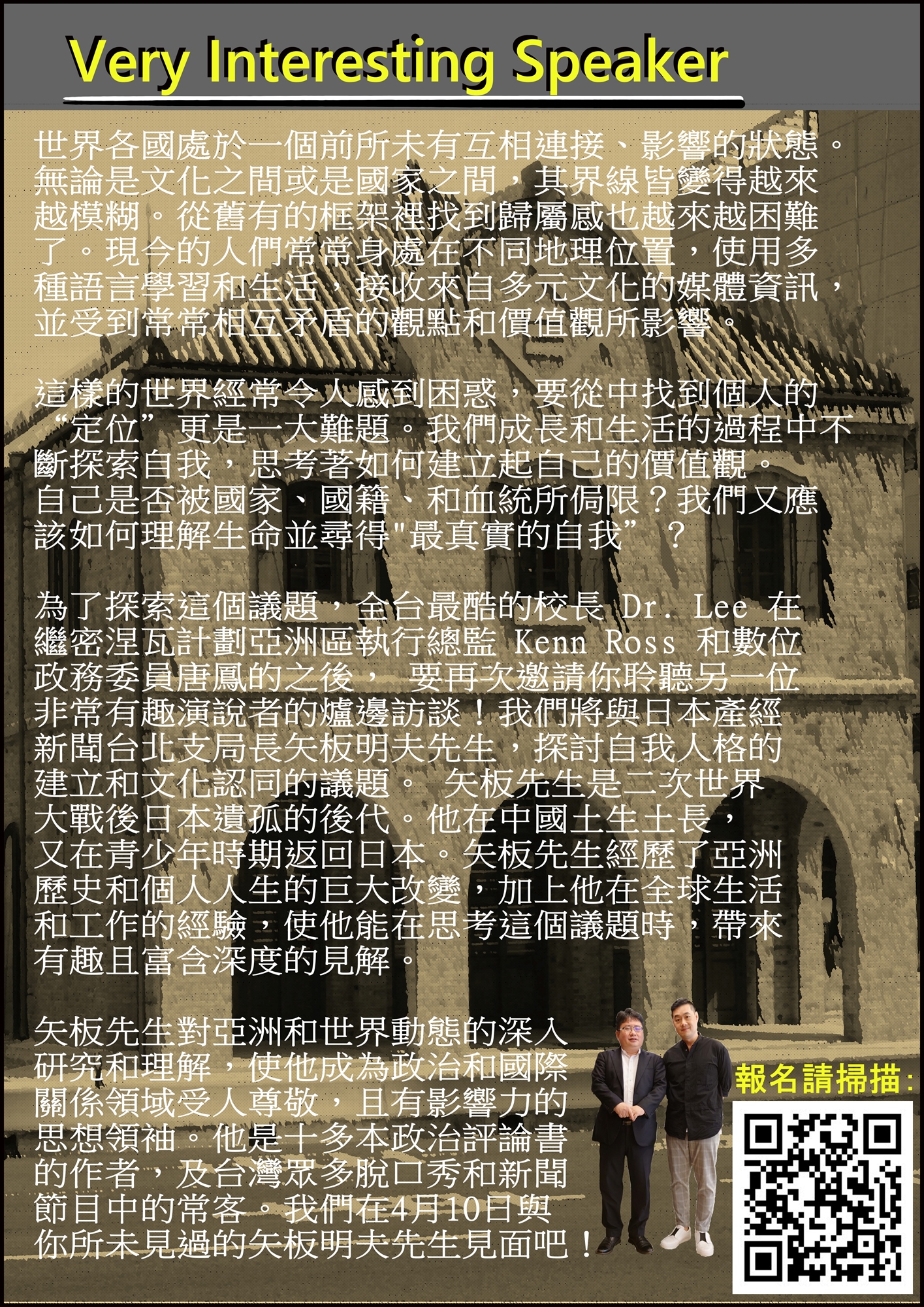 為了探索這個議題,全台最酷的校長 Dr. Lee 在訪談繼密涅瓦計劃亞洲區執行總監 Kenn Ross 和數位政務委員唐鳳的之後, 要再次邀請你聆聽另一位非常有趣演說者的爐邊訪談!我們將與日本產經新聞台北支局長矢板明夫先生,探討自我人格的建立和文化認同的議題。 矢板先生是二次世界大戰後日本遺孤的後代。他是在中國土生土長的日本人,在青少年時期返回日本,這獨特經歷,加上在全球生活和工作的經驗,使他能在思考這個議題時,帶來有趣且富含深度的見解。
