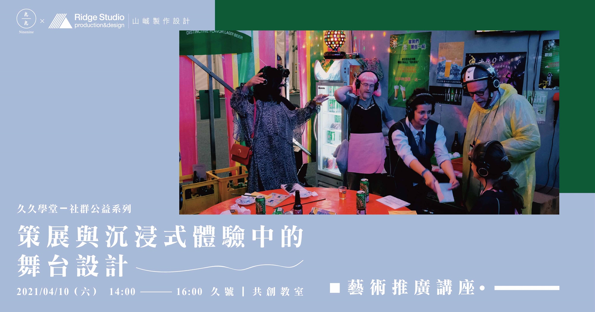 本講座將帶大家了解如何讓舞台設計成為觀眾浸潤身心的場域?展覽本身的敘事潛能如何藉舞台設計透顯?在沉浸式劇場日漸興盛且形式多變的今日,不論國內國外,它的定位會因多元而被確立亦或更加模糊?本場演出將從舞台設計的視角出發,開啟一段從劇場、劇本開始的沉浸式策展之旅。