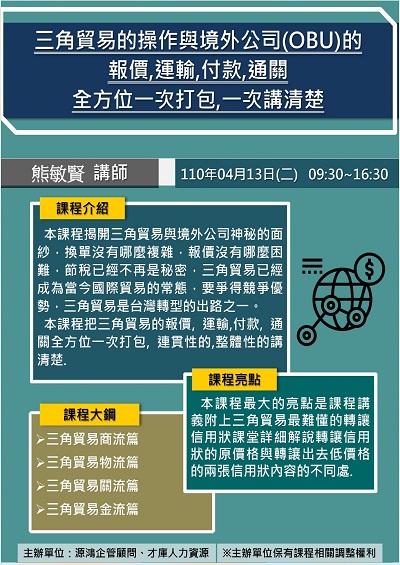 110/04/13(二)三角貿易的操作與境外公司(OBU)的報價,運輸,付款,通關全方位一次打包,一次講清楚 熱烈招生~