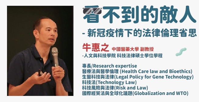 牛教授的專長在醫療法與醫學倫理 、生醫科技與法律、科技法、科技風險與法律、國際經貿法與全球化議題等領域都有所專精,而這次將以“看不到的敵人 - 新冠疫情下的法律倫理省思”為主題,介紹在新冠肺炎“全球化”的過程中,不論是從各國對傳染病的防治,或透過跨國合作的過程中,所引發的不同型態法律與倫理爭議。