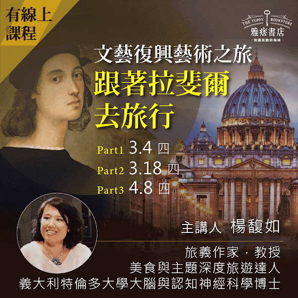 本場講座帶大家跟著文藝復興大師拉斐爾的腳步,走一趟義大利的深度旅行!一邊欣賞名畫山水,一邊品茗美食,適合對「文藝復興藝術」與「義大利旅遊與美食」有興趣的人參加。