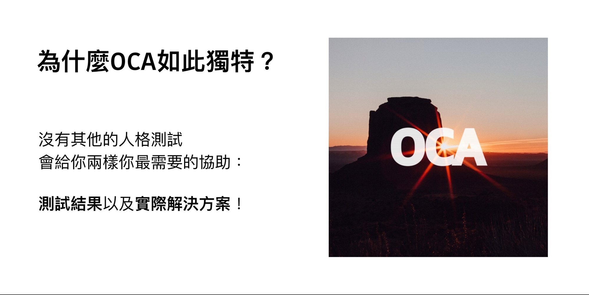 OCA(Oxford Capacity Analysis)中名為牛津能力分析,是一個針對個人能力的評估,10個特質組成你的人格,進行完這個測試之後,你將會了解如何才可以突破自己的枷鎖,成為更加優秀、健全及快樂的人!