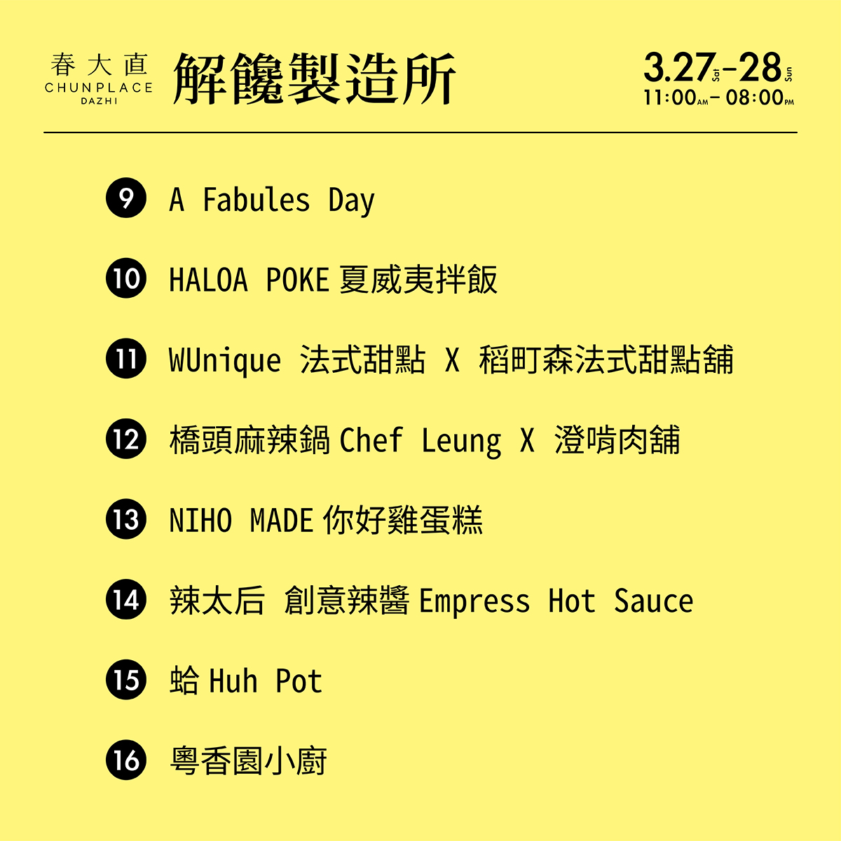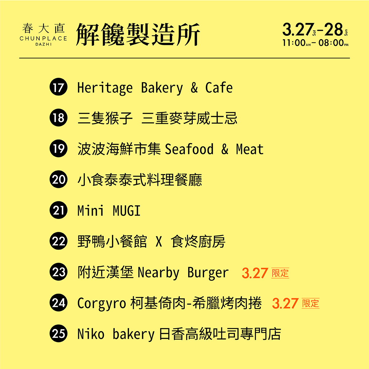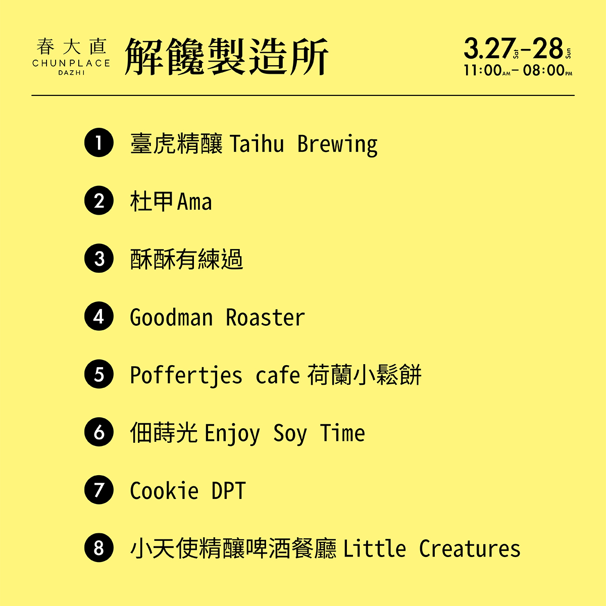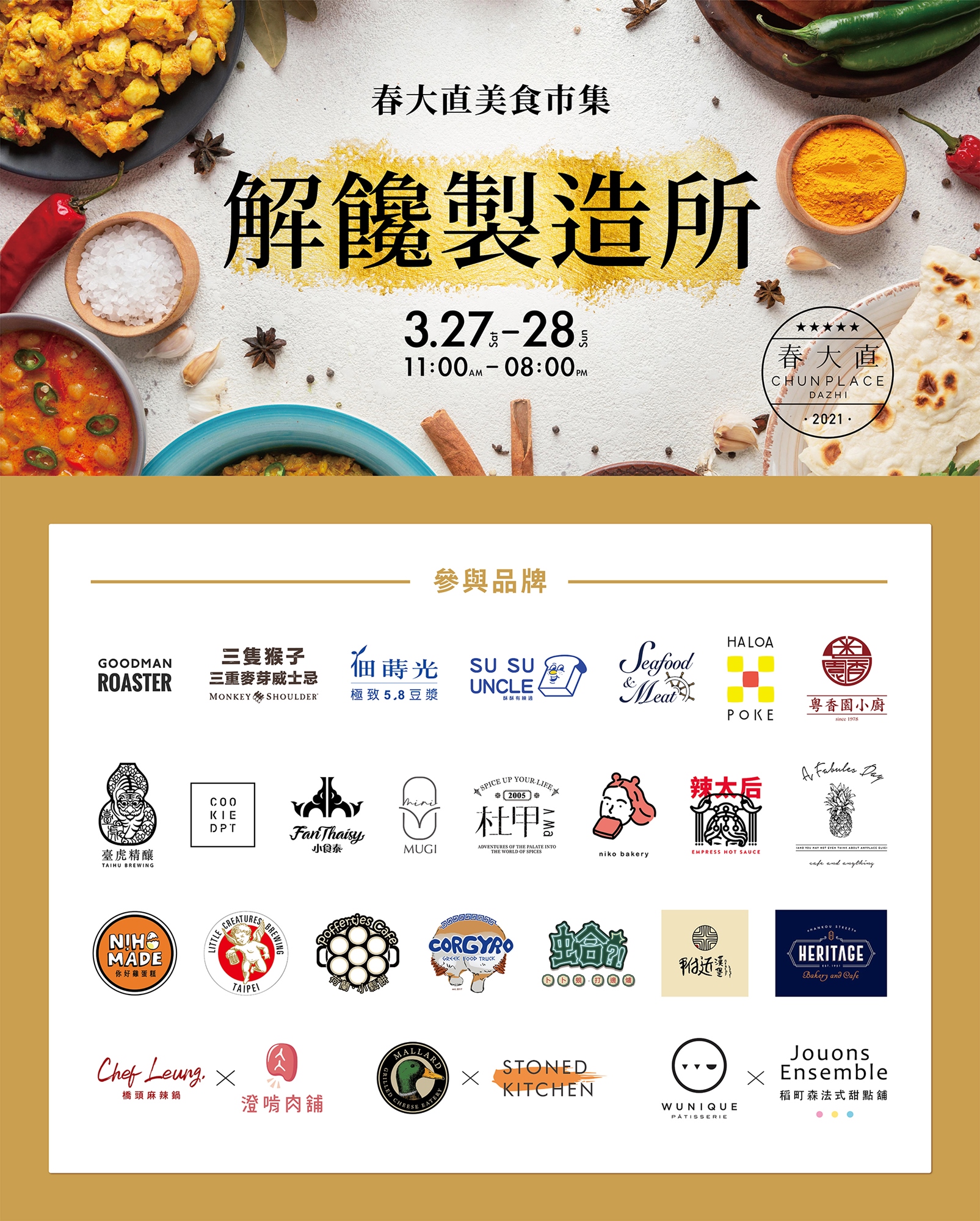 此次春大直募集了許多首次參與戶外市集的超優質店家、赫赫有名的網路人氣美食、甜點咖啡職人、各式風格餐車等,除了嚴選食材用料,不惜成本將龍蝦、熟成21天穀飼牛等高檔食材入菜,搭佐超人氣必備啤酒與威士忌特調,更以各式技術聯名、中西合璧、美日融合的精湛廚藝手法,中、美、日、港、泰的跨界匯聚,讓您一次品足酸甜苦辣的箇中滋味,勢必帶來刺激味蕾的驚喜體驗。這些獨家限定私房風味,只有在春大直的「解饞製造所」才吃得到!