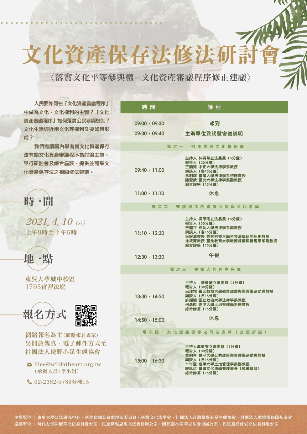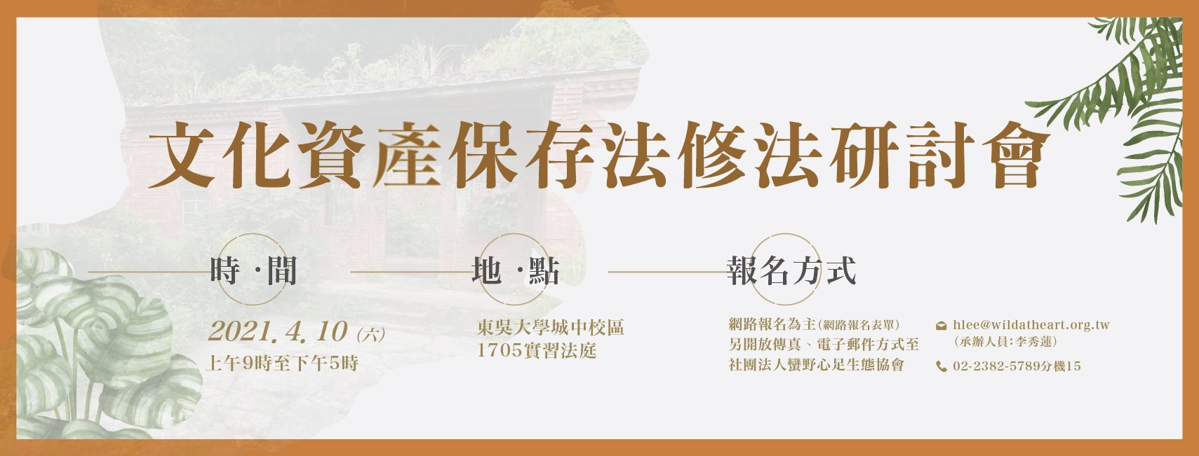 為此,由東吳大學公法研究中心、臺北律師公會環境法委員會及民間團體社團法人台灣文化法學會、社團法人台灣蠻野心足生態協會與財團法人環境權保障基金會,邀請國內學者就文化資產保存法有關文化資產審議程序為討論主題,舉行研討會及綜合座談,提供並蒐集文化資產保存法之相關修法建議。