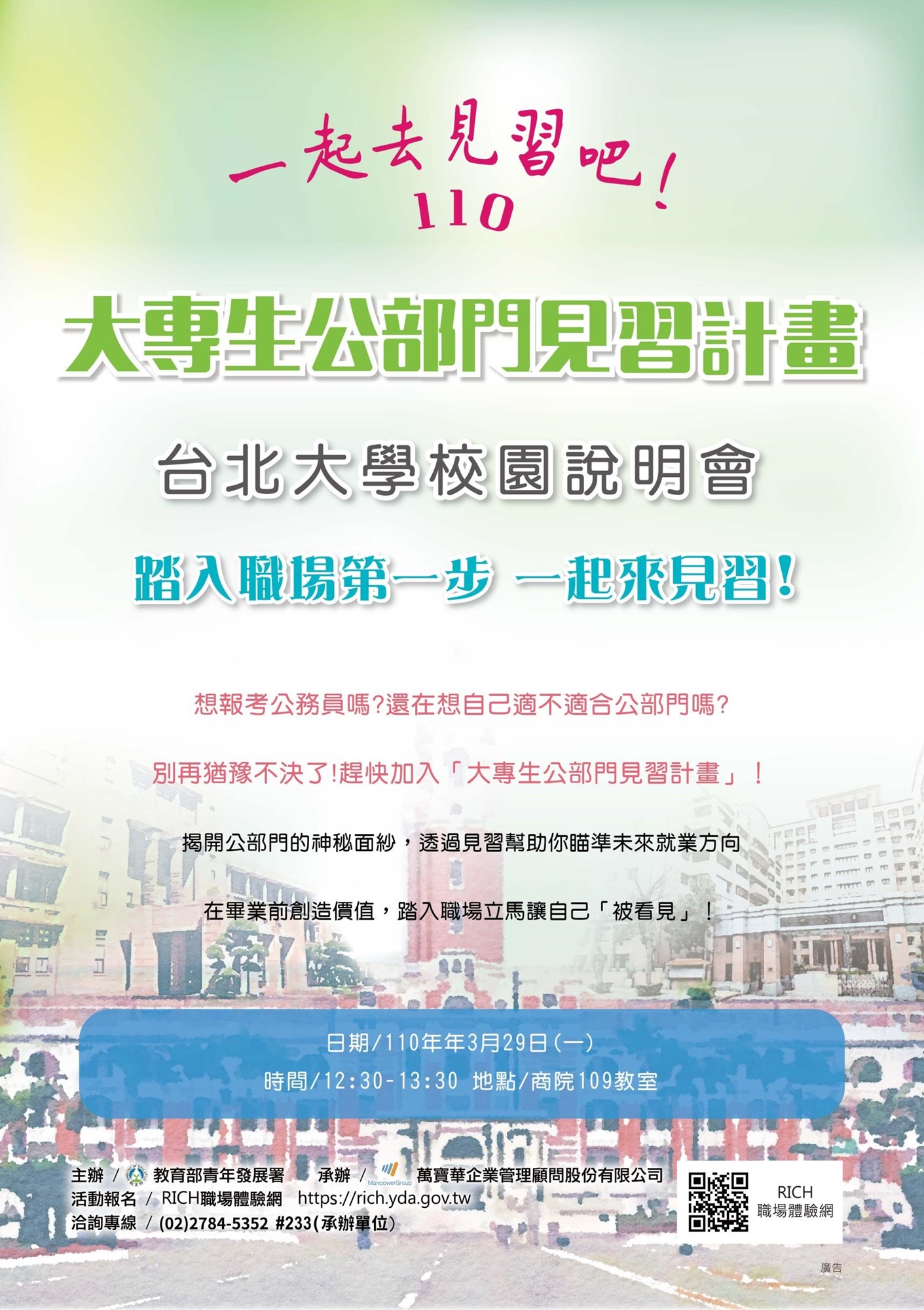 【110年度大專生公部門見習計畫】校園說明會 -台北大學場