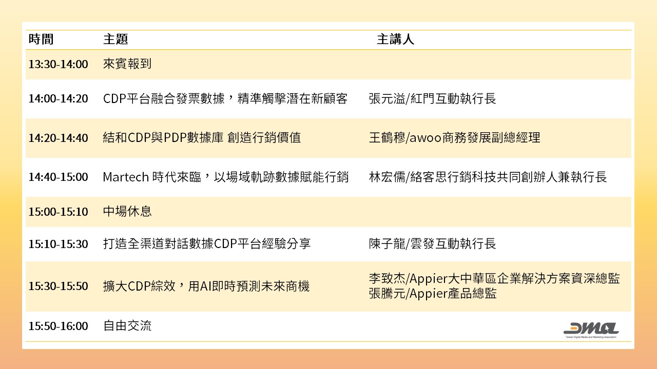 繼3/24舉辦【數據混搭-後Cookie時代廣告投放】後,DMA協會針對顧客數據平台(Costumer Data Platform, CDP),加碼舉辦【數據之戰-自建CDP數據庫 創造行銷價值】活動,探討未來廣告投放的解決方案,一同創造數位行銷共榮圈。