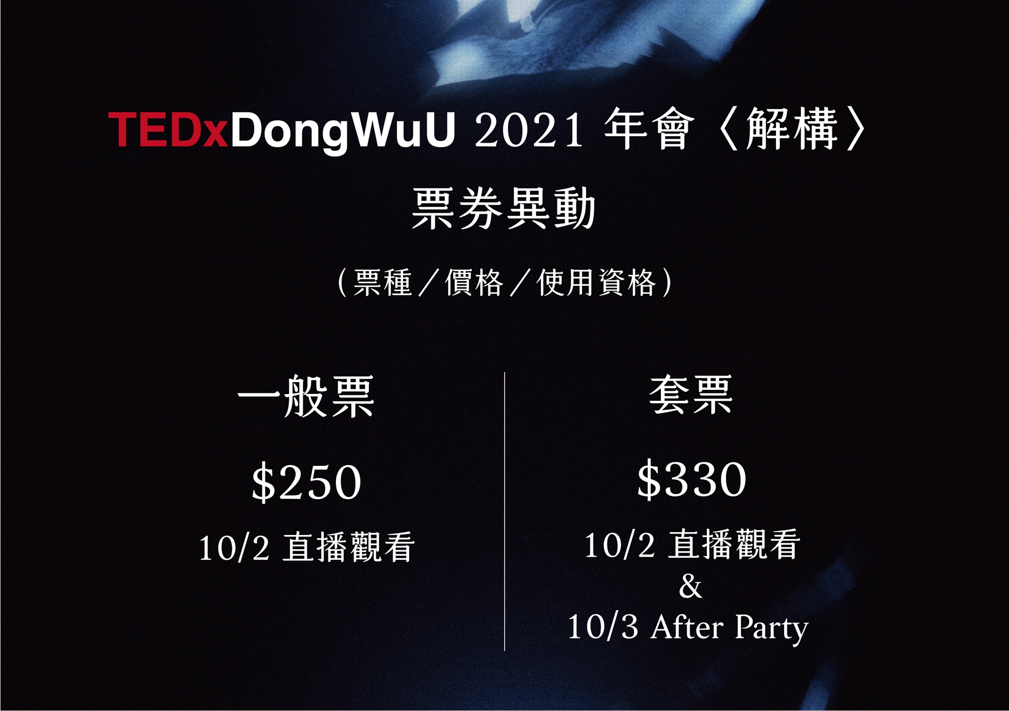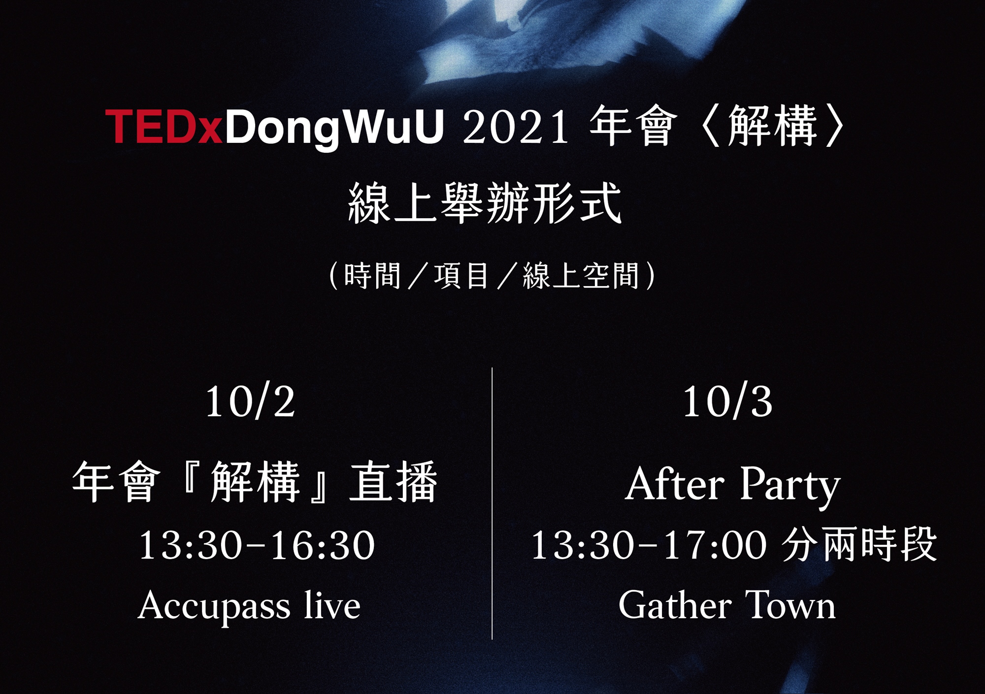 FB:TEDxDongWuU/Email:tedxdongwuu2021@gmail.com