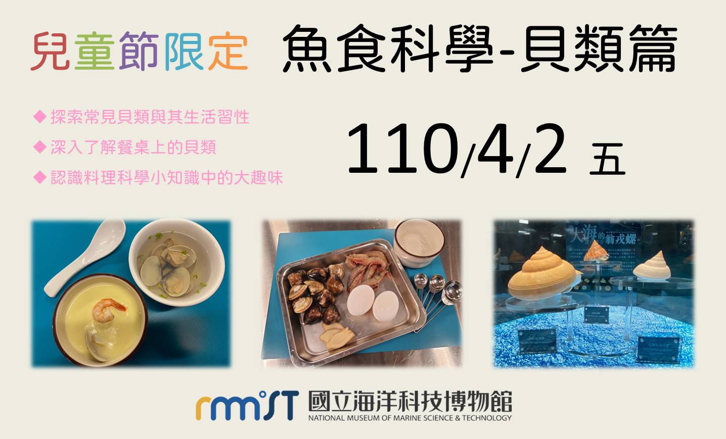 不論是大朋友小朋友,對魚餐桌上的海鮮都十分陌生,國立海洋科技博物館特別規畫一系列的食魚教育課程,首先魚兒童節推出貝類篇課程內容,多樣化的體驗課程設計,讓參與學童從遊戲中認識各種貝類並了解其生態習性。除了基礎知識外,也於館內「生態廚房」指導學員進行海鮮食材的簡易處理與烹飪藉由實作得到豐富的料理科學知識。