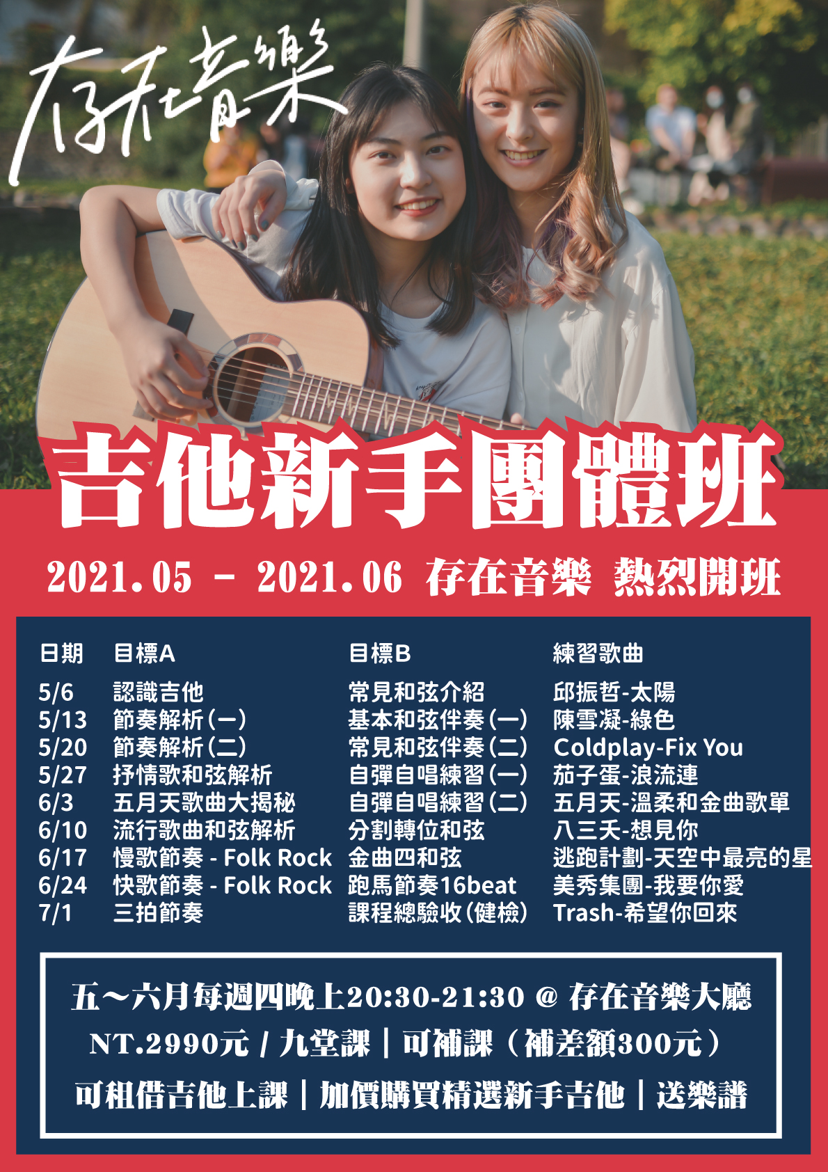 額外+500元(九堂課都可以直接使用教室吉他,如果最後決定在存在購買吉他,可全額折抵)
