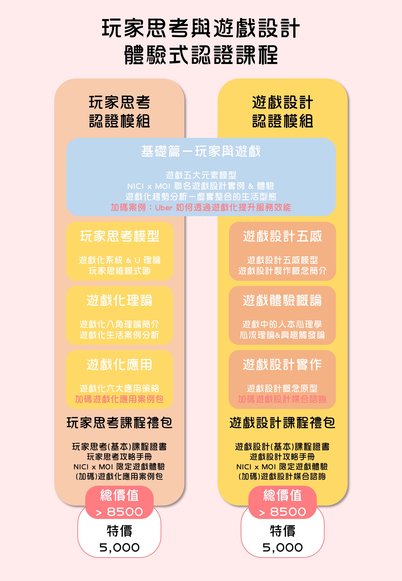 玩家思考與遊戲設計|體驗式認證課程,將透過兩場次的免費體驗工作坊,讓玩家快速掌握玩家思考與遊戲設計的概念與社群運作的模式。成功報名體驗式認證課程者,將依報名場次進行為期三週的主題認證課程,完成課程後將頒發由 NICI 與 MOI Education 聯名認證的遊戲化社群證書!