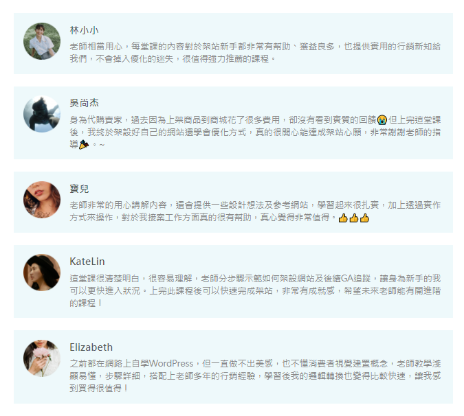 - KK老師擁有十餘年國/內外知名品牌行銷經驗,講解建置商用網站正確的思考邏輯,提供最正確的架站技巧與相關知識,並充分發揮WordPress對搜尋引擎友善特性,有效提升行銷轉換率、自然流量及企業獲利。