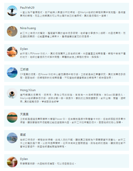 - 講師擁有十餘年教學經驗及跨產業豐富的實戰案例,從政府機關至外商公司…等,輔導超過2千位學生,帶領 學員從中學習Power BI的操作技巧與Know-how。
