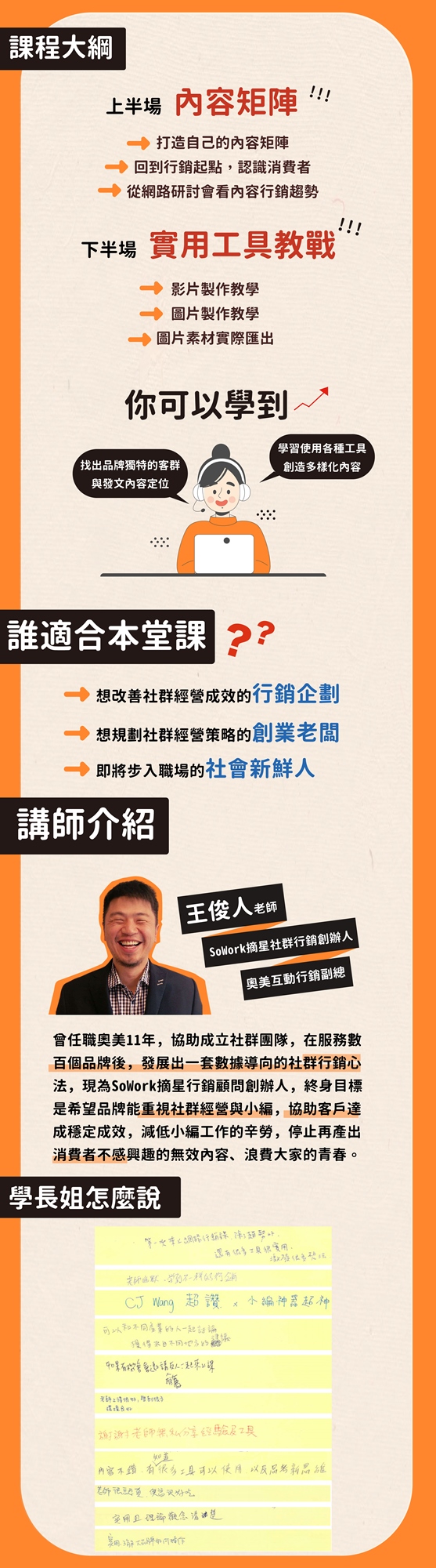 《SoWork摘星社群行銷》創辦人、前《奧美互動行銷》副總經理 王俊人老師CJ Wang,前來分享他投入數百個小時,研究國內外各項社群行銷工具後找到的小編神器系列,分析消費者、研究競爭品牌,找出品牌核心價值,還能快速做圖、做影片、做IG限時動態,讓你從此學會以科技取代人力,不僅效率提升,專業度也會一起飆升!