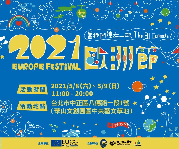 2021年5月8-9日歐盟及十五國會員國在台辦事處將在 華山文創園區中央藝文草地 舉辦【2021Europe Fair歐洲節】,現場有歐洲美食、歐洲美酒(紅酒、威士忌、啤酒...等)、歐盟駐台十五個辦事處攤位,現場超過50個攤位參展,還有大型遊樂體驗,帶您周遊歐洲列國!
