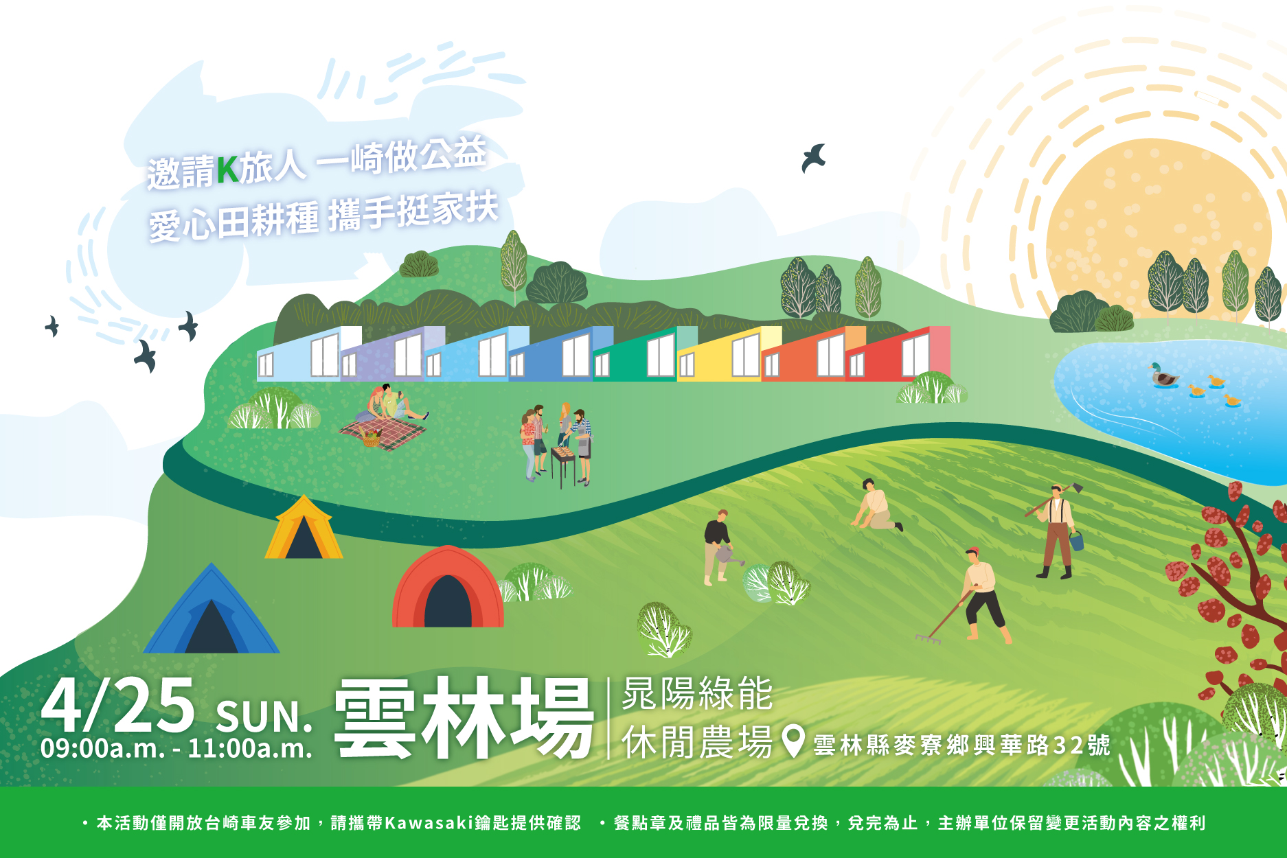 首場將於4月25日於雲林晁陽綠能休閒農場舉辦,當天除了可免費享用農場特有天然健康料理外,也會由農場帶領K旅人車主進行愛心田認養耕種體驗活動,種下的蔬菜作物在經過45-60天農場的細心照料及收成後,將全數贈與給需要的弱勢族群!