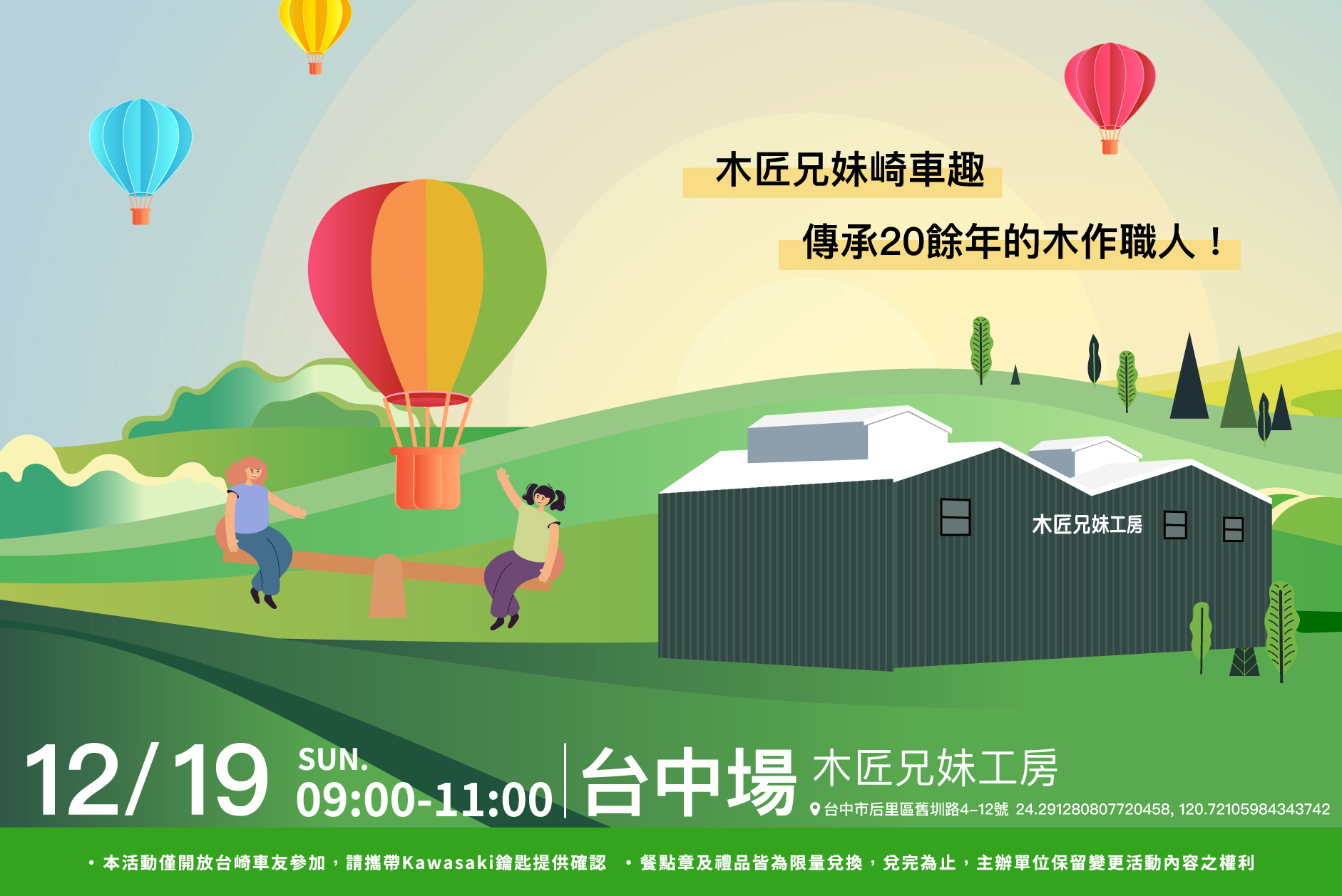 用木頭玩創意!台中后里的木匠兄妹傳承自父親的細木作工藝,為其加入設計、童趣、好玩的元素,讓古板的木頭素材有了耳目一新的風貌。2021 Kawasaki崎車趣最終場,邀請K旅人車主們一同體驗傳承20餘年的木作職人精神,感受木製手作的溫潤觸感,同時還可享用由木匠兄妹精心安排的特色餐盒!