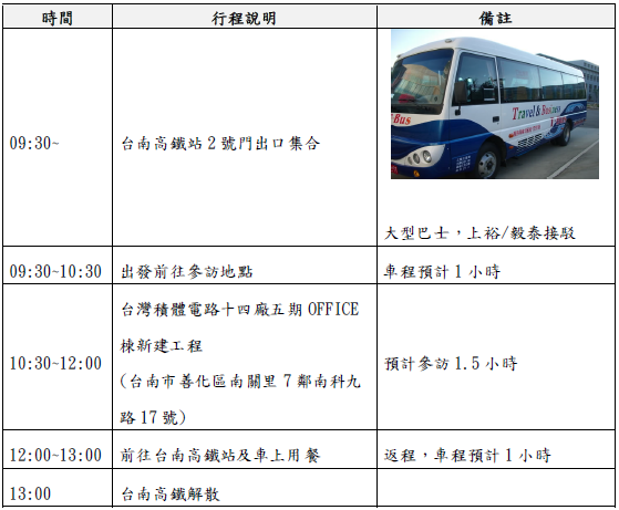 三、行程規劃如下:時間依現場狀況調整,請參訪人員協助配合。