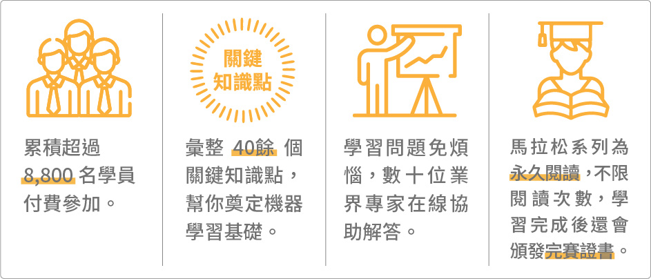 - AI 學習馬拉松系列購買完成後,即可永久閱讀,不限閱讀次數,學習完成後還會頒發完賽證書。已累積共超過 8,800 多位學員參與,想要與專家與同好一起學習的朋友,這次要把握機會報名。本屆馬拉松除了有更多 AI 專家加入、原有教材再升級,提供更多延伸閱讀,幫你更有系統掌握 AI 知識。