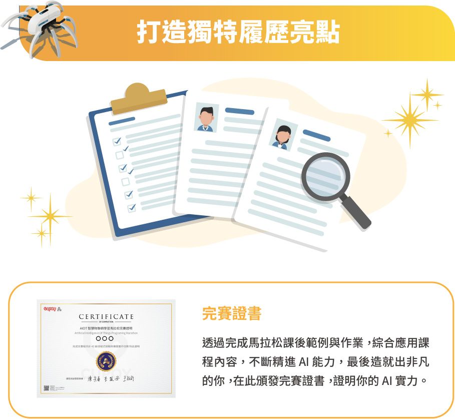 - 參與並完成期末專題指定目標,將頒發完賽證書。