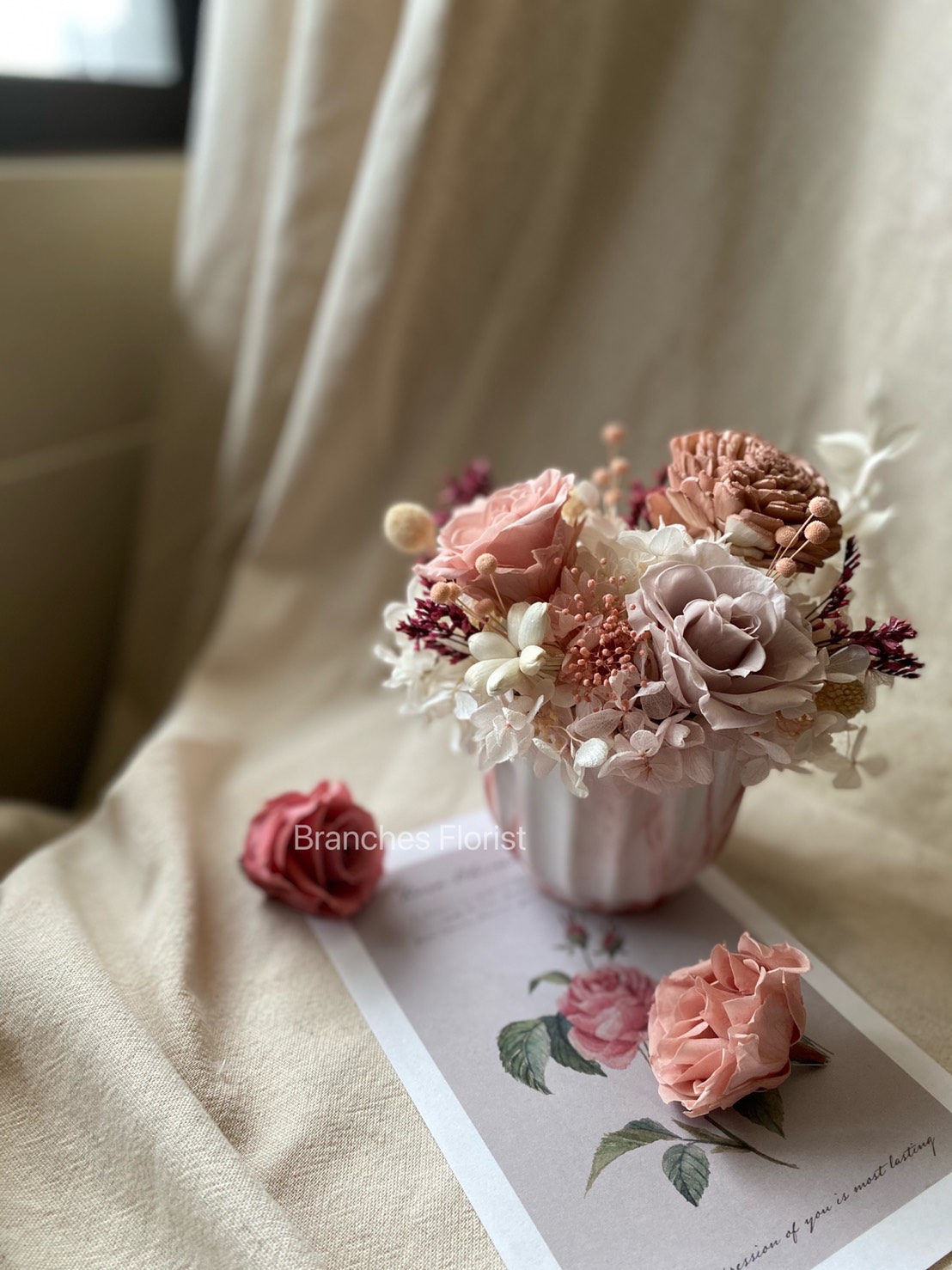 以乾燥玫瑰色系作為基礎,搭配上奶茶色的不凋 花
