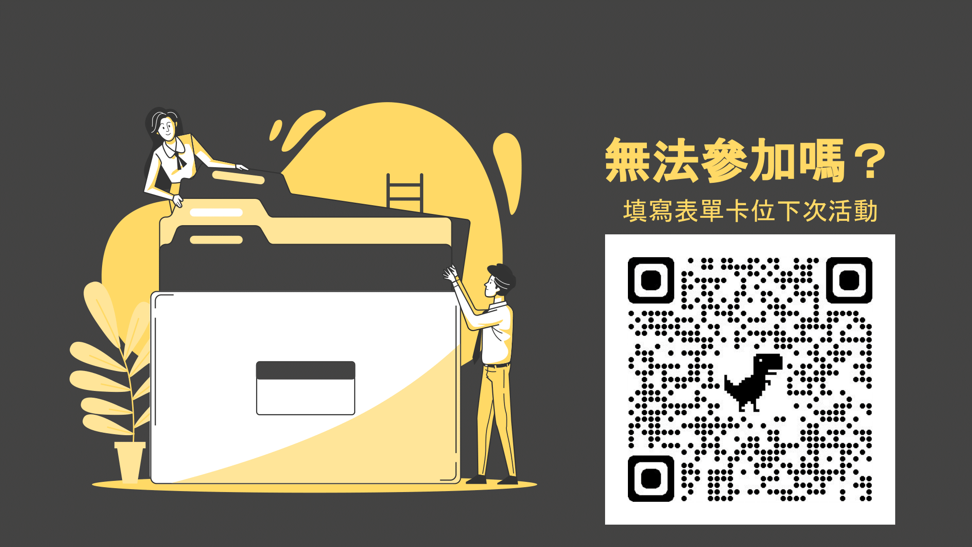 無法參加嗎?填寫表單卡位下次活動:https://forms.gle/4zUL26vera8QhvL19