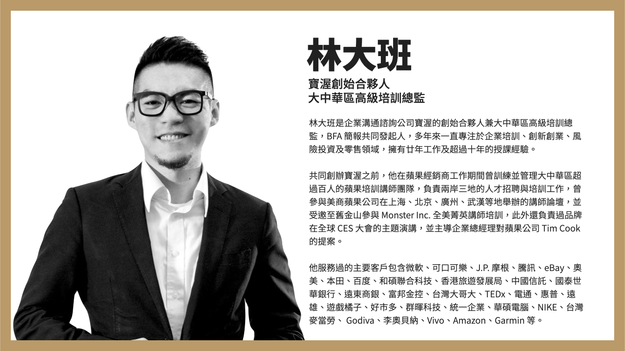林大班是企業溝通諮詢公司寶渥的創始合夥人兼大中華區高級培訓總監,職場溝通社群 BFA 簡報共同發起人,主要負責培訓、投資業務及運營管理工作,同時也是台灣首個創業路演主題訓練營:PitchCamp 的共同創辦人。林大班多年來一直專注於企業培訓、創新創業、風險投資及零售領域,擁有廿年工作及超過十年的授課經驗,在兩岸都是一位極受知名企業與職場人士喜愛的商務演示顧問、講師與專欄作者,並於 2017 獲選關鍵評論網的未來大人物。