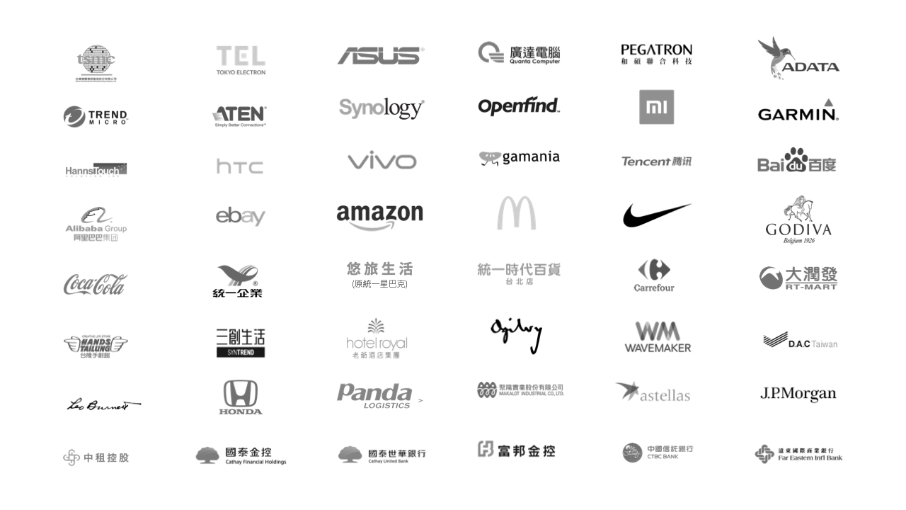 他服務過的主要客戶包含台積電、友達、微軟、可口可樂、J.P. 摩根、騰訊、eBay、奧美、本田、百度、和碩聯合科技、香港旅遊發展局、中國信託、國泰世華銀行、遠東商銀、富邦金控、台灣大哥大、PChome、TEDx、電通、惠普、遠雄、遊戲橘子、好市多、群暉科技、統一企業、大潤發、威剛科技、趨勢科技、華碩電腦、NIKE、台灣麥當勞、 Godiva、李奧貝納、Vivo、Amazon、Garmin 等。